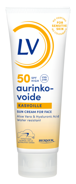 Hajusteeton ja väriaineeton LV Aurinkovoide kasvoille on helposti levittyvä ja imeytyvä korkean suojakertoimen (SPF50) aurinkovoide joka jättää iholle pehmeän mattamaisen tunteen. Aloe vera ja hyaluronihappo kosteuttaa ja hoitaa ihoa. Herkälle iholle sopiva, antaa korkean suojan UVA ja UVB-säteitä vastaan suojaten kasvojen ihoa auringolta ja sen aiheuttamalta ennenaikaiselta vanhenemiselta.