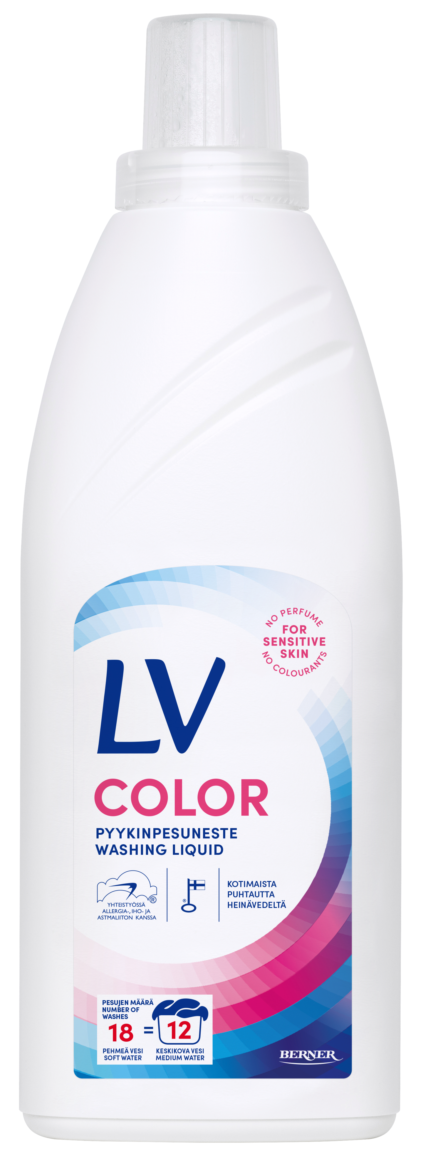 LV 750ml Color on hajusteeton ja väriaineeton pyykinpesuaine kirjopyykille. Pyykinpesunesteessä on kaksi entsyymiä, jotka tehostavat sekä proteiini- että rasvatahrojen poistoa. Tuote on valmistettu Suomessa ja sillä on Avainlippu-merkki. LV-tuotteet on kehitetty yhdessä Allergia-, Iho- ja Astmaliiton kanssa.