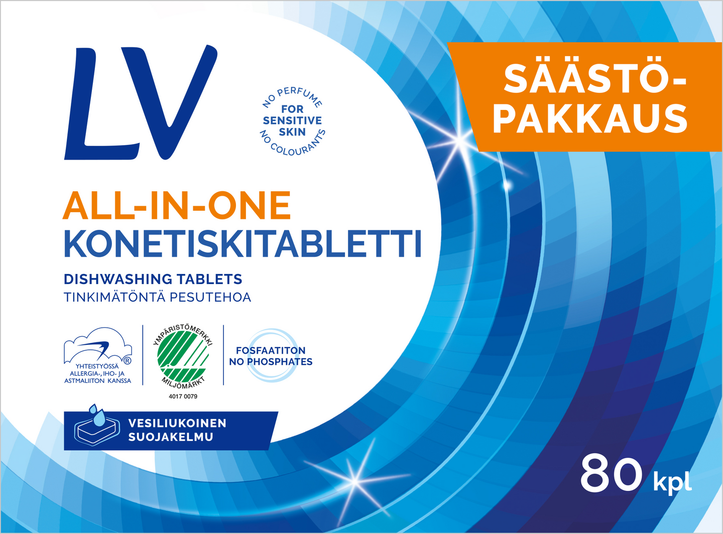 LV Astianpesutabletti All-in-one puhdistaa ja kirkastaa astiat tehokkaasti. Yksi tabletti sisältää vedenpehmentäjän, lasinsuojan sekä huuhtelukirkasteen. Tabletti liukenee nopeasti, joten pesuteho on hyvä lyhyemmissäkin ohjelmissa. Fosfaatiton tuote ei rehevöitä ympäristöä, joten se on parempi valinta ympäristölle. Tabletin vesiliukoista suojakelmua ei tarvitse poistaa, joten tuote ei joudu kosketuksiin ihon kanssa. Uudelleen suljettava pakkaus on turvallinen.
