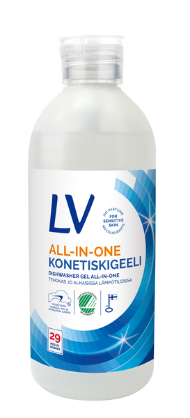 LV konetiskigeeli puhdistaa tehokkaasti ja tuo kirkkautta astioillesi. Se sopii erinomaisesti myös pikapesuun ja alhaisiin lämpötiloihin. Geeli liukenee nopeasti ja sitä on helppo annostella pieneenkin koneeseen. Hausteeton ja väriaineeton.