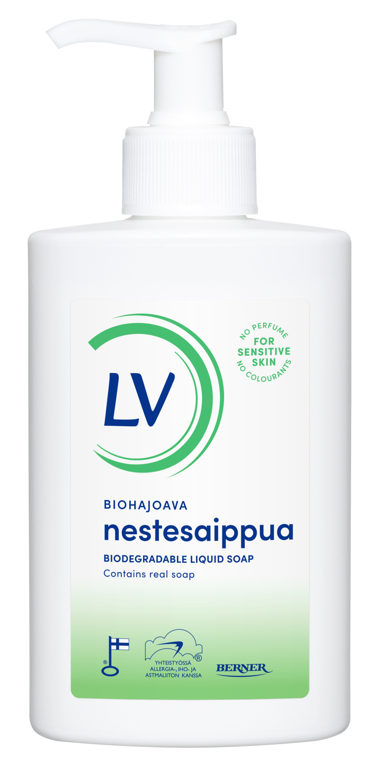 Biohajoava nestesaippua on herkälle iholle luontoa kunnioittava vaihtoehto niin kotiin kuin kesämökillekin. Hajusteeton ja väriaineeton nestesaippua sopii käsien ja tarvittaessa vartalonkin pesuun koko perheelle. Aitoa saippuaa. Kehitetty yhdessä Allergia- ja Astmaliiton kanssa. Valmistettu Suomessa ja tuotteelle on myönnetty Avainlippu-tunnus.