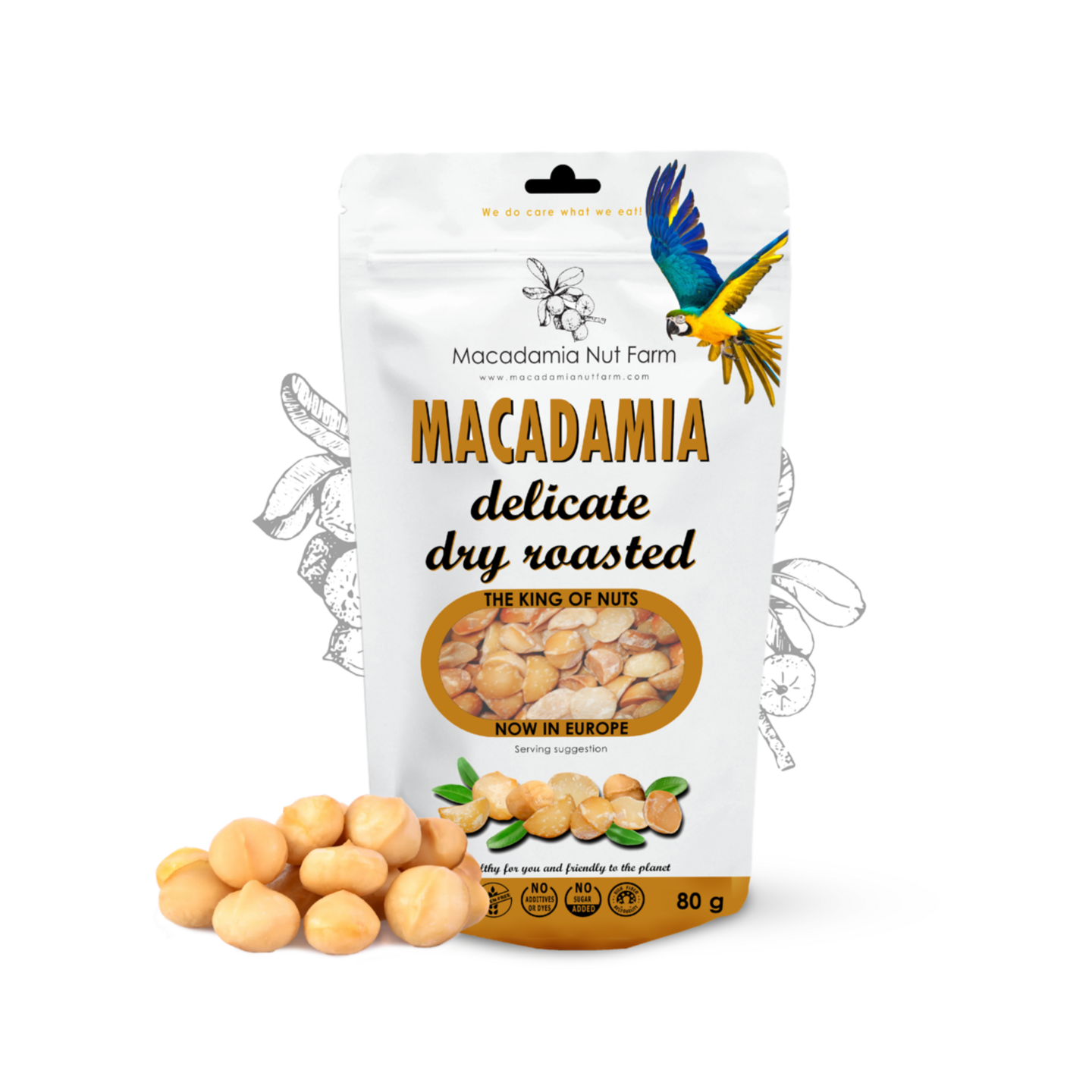 Rapeaksi paahdetut pähkinät ovat täydellinen välipala, kun kaipaat täyteläisiä makuja! Viimeisimmän sadon macadamiapähkinät kuoritaan ja paahdetaan tehtaallamme Liettuassa, jotta voimme tarjota vain tuoreita ja rapeita pähkinöitä. Käytämme kuivapaahdotustekniikkaa, joten emme lisää öljyä tai muita lisäaineita.