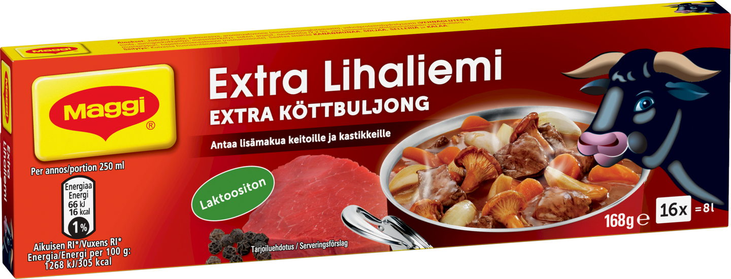 LaktoositonMAGGI 16-palaiset lihaliemikuutiot ovat ne perinteiset liemikuutiot, jotka ovat jo vuosia kuuluneet suomalaisten arkeen. MAGGI-liemikuutiot ovat täydellinen apu ruoanlaitossa. Liemikuution voi lisätä vaikka pastan tai riisin keitinveteen, keittoihin tai kastikkeisiin, aina kun haluat ruokiisi ekstrahyvän maun.