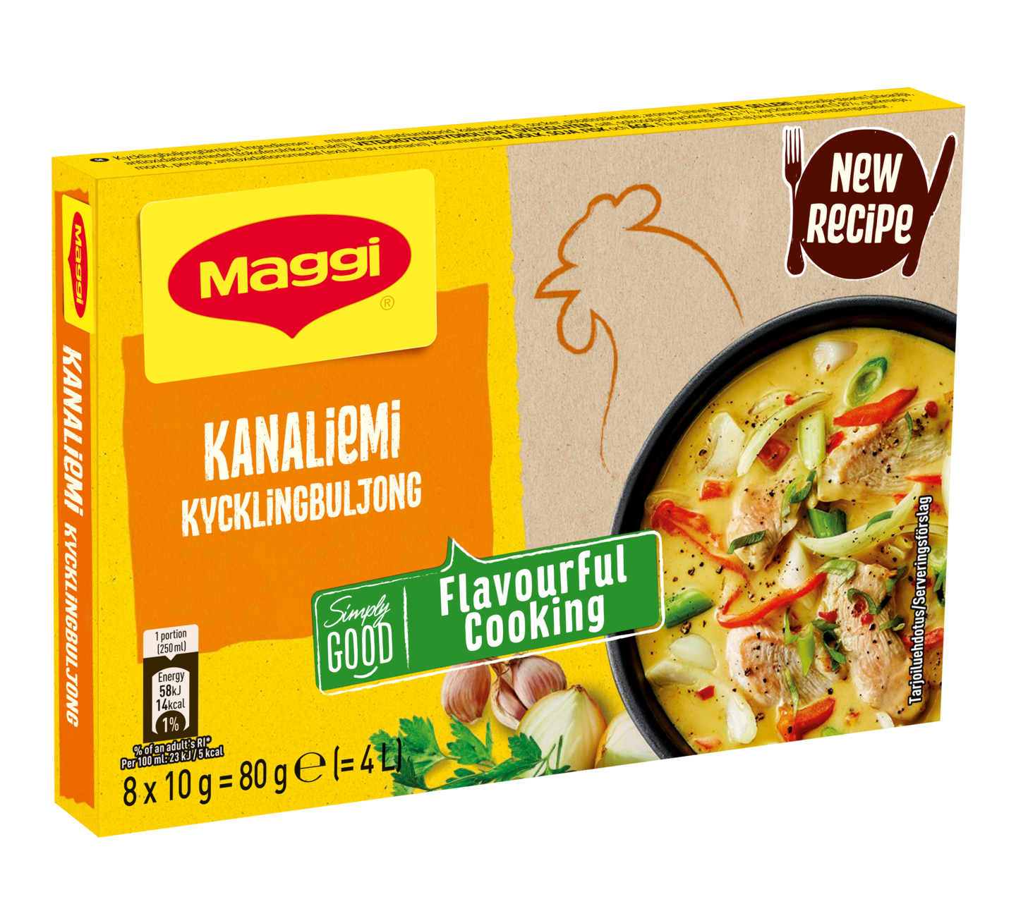 Mineraalisuola (natriumkloridi, kaliumkloridi), sokeri, perunatärkkelys, aromit (sis. VEHNÄÄ, SELLERIÄ), sheaöljy steariini [sheaöljy, hapettumisenestoaine (tokoferoliuute)], VEHNÄPROTEIINIHYDROLYSAATTI (VEHNÄGLUTEENI, suola, auringonkukkaöljy), kananrasva 2,1 %, kanauute 0,8%, kurkuma, porkkana, persilja, hapettumisenestoaine (rosmariiniuute). Saattaa sisältää MAITOA, SOIJAA, KALAA ja KANANMUNAA.