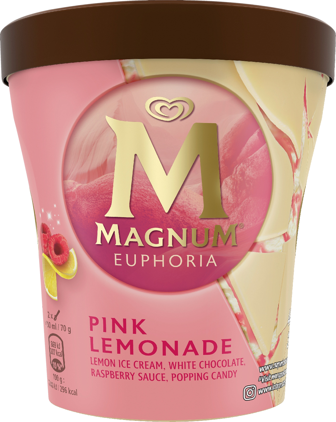 Uusin ja ylellisin Magnum-jäätelökokemus: Magnum Euphoria sisältää sitruunajäätelöä ja kätkee sisäänsä vadelmasorbettisydämen. Raikas kokonaisuus on kuorrutettu Magnumin tunnetulla valkosuklaalla sekä poksahtelevilla rakeilla. Täydellinen jälkiruoka ylelliseen koti-iltaan kätevässä purkissa. Avaa purkki ja lohkaise rikki Magnum-suklaan paksu kuori ja löydä samettinen sitruunajäätelö, ja kaikki sen alla oleva ihanuus. Sitruuna, sorbetti ja valkosuklaa – mikä täydellinen jälkiruoka! Magnum Euphoria tarjoaa ainutlaatuisen kokemuksen herkutella ylellisesti sekä luvan hassutella ja olla hieman vallaton. Uskomme, että päivä ilman nautintoa on hukkaan heitetty päivä, koska ilo ja nautinto tekevät elämästä elämisen arvoista. Yksityiskohdat ovat tärkeitä. Asiantuntijoitamme motivoi intohimo, tarkkuus ja rakkaus jäätelöön. Käytämme tuotteissamme vain huolella valittuja raaka-aineita. Tiivis yhteistyömme Rainforest Alliancen kanssa varmistaa sen, että kaikki kaakaopapumme tuotetaan vastuullisesti. Niillä on edessään pitkä tie, ennen kuin niistä tulee Magnum-suklaata. Kyse on laadusta ja kestävästä toiminnasta koko matkan ajan. Rohkaisemme kaikkia tarttumaan hetkeen ja hemmottelemaan itseään pienellä ylellisyydellä. Magnumin ansiosta jäätelön nautiskelijat ympäri maailmaa voivat nauttia poikkeuksellisen laadukkaasta suklaa- ja jäätelökokemuksesta. Valikoimastamme löytyy jäätelö jokaiseen makuun, ja vaihtoehtoja myös vegaaneille. Mikä jäätelömaku on sinun suosikkisi? Älä unohda, että kun haluat pitää Magnum-jäätelösi aina yhtä hyvänä, tulee se säilyttää -18 °C:ssa tai kylmemmässä parhaan jäätelönautinnon saavuttamiseksi. Kun jokaiseen yksityiskohtaan paneudutaan äärimmäisellä huolellisuudella, lopputuloksena on jotain ainutlaatuista. Sellaista kuin Magnum. Tutustu kaikkiin Magnum-jäätelöihin ja löydä kokonainen nautintojen maailma.