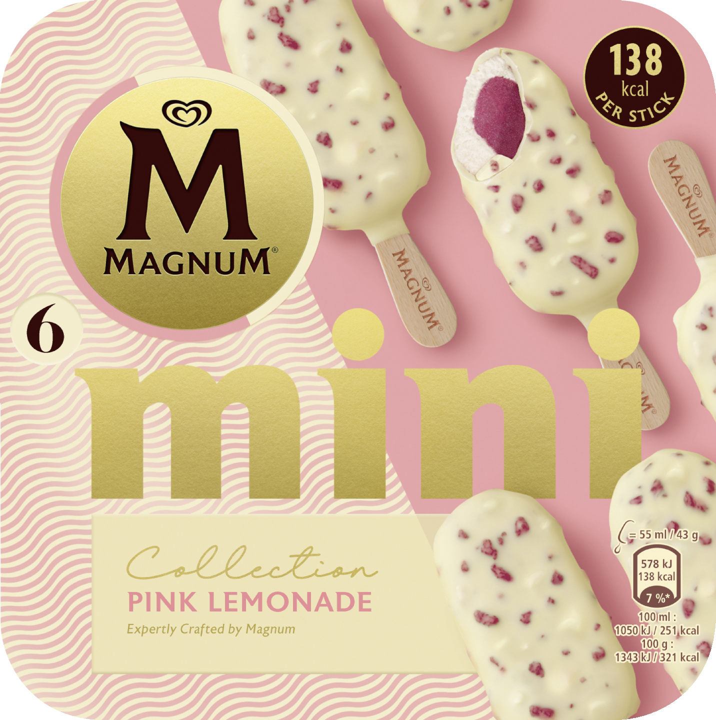 Koe ylellinen Magnum-jäätelönautinto! Magnum Mini Pink Lemonade Jäätelö Monipakkaus sisältää 6 minikokoista Magnum-jäätelöpuikkoa kätevässä pakkauksessa. Nauti yksin tai yhdessä ystävien kanssa – täydellinen jäätelönautinto on taattu!