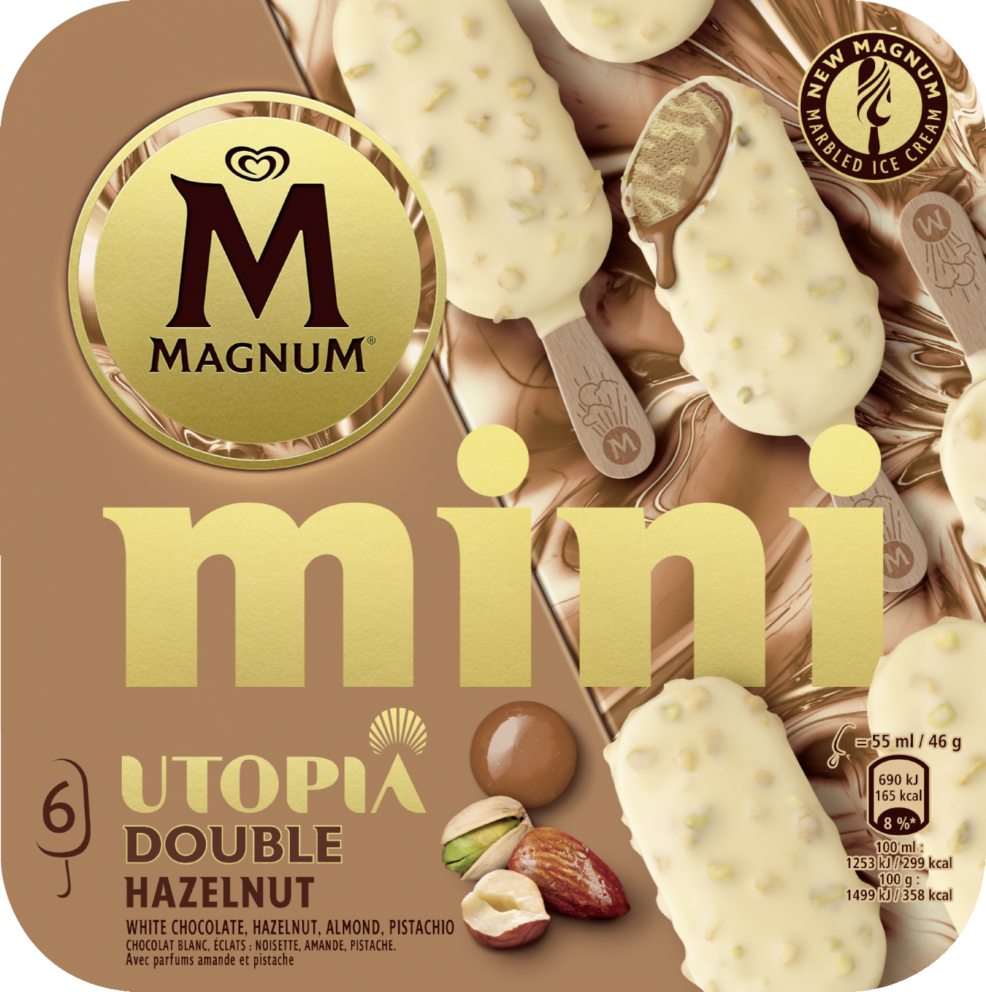 Magnum Utopia Mini Double Hazelnut Jäätelö Monipakkaus on täydellinen jälkiruoka niille, jotka eivät voi saada tarpeekseen Magnumista. Nauti se yksin tai jaa ystäviesi kanssa. Jokainen pakkaus sisältää 6 minikokoista jäätelöä.