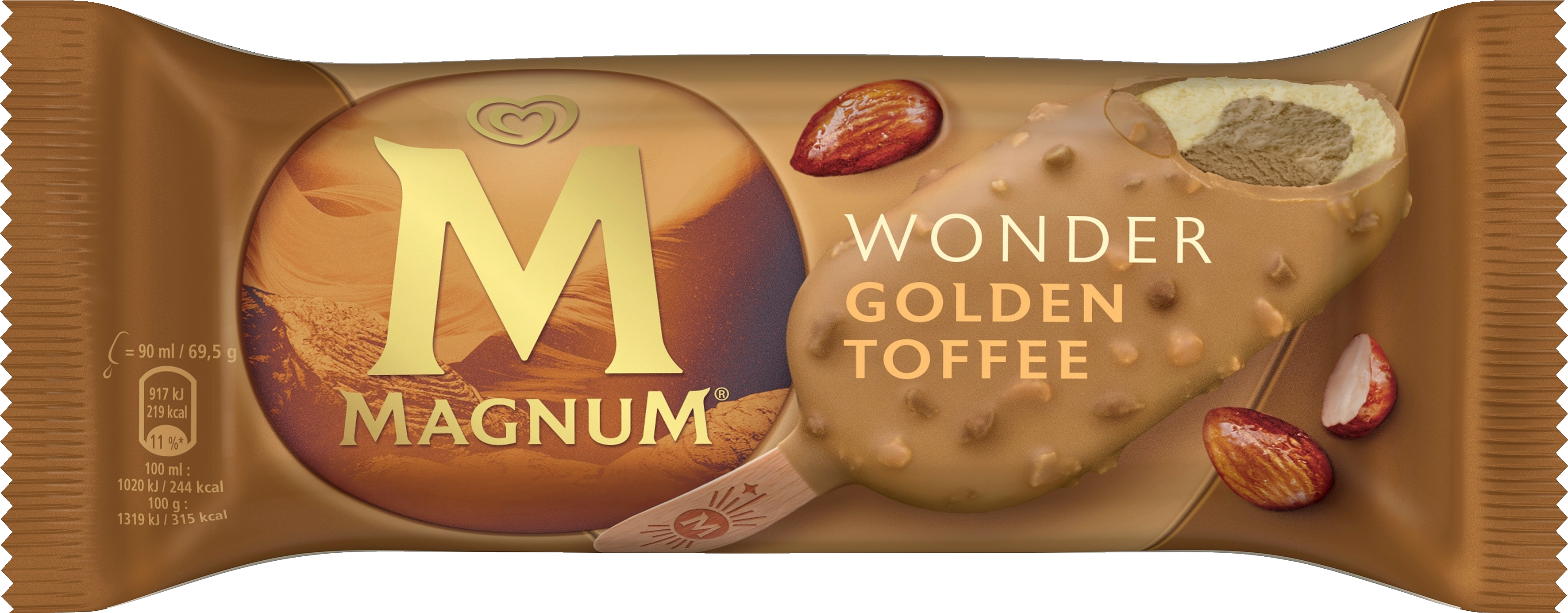 Uusin ja ylellisin Magnum-jäätelökokemus: samettista jäätelöä, joka kätkee sisäänsä karamellijäätelösydämen. Täyteläinen kokonaisuus on kuorrutettu Magnumin tunnetulla kullanvärisellä karamellisoidulla suklaalla sekä karamellisoiduilla mantelipaloilla.
