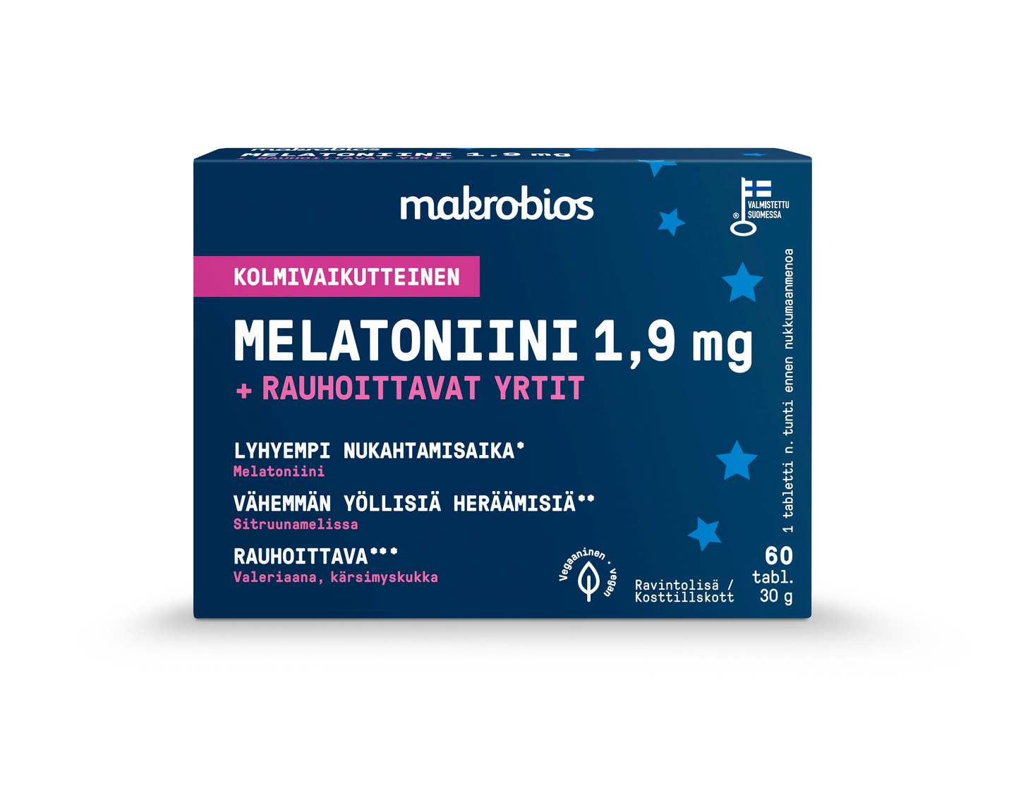 Makrobios kolmivaikutteinen Melatoniini 1,9mg + rauhoittavat yrtit 60 tablettia 30g