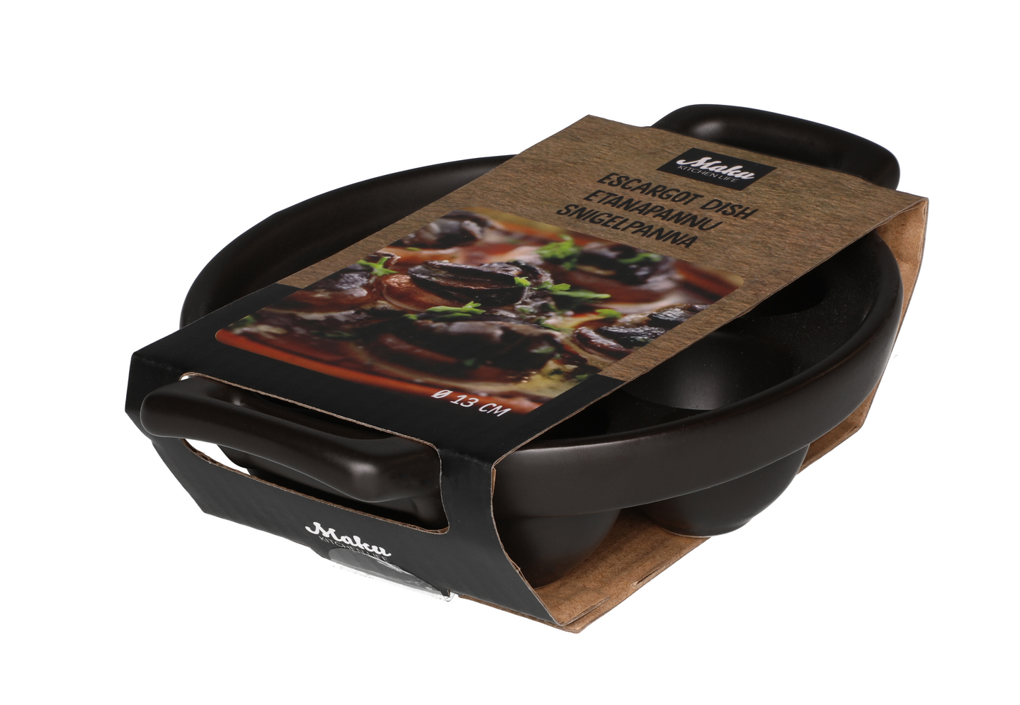 Keraaminen etanapannu kuudelle etanalle. Soveltuu uunikäyttöön max. 220 asteeseen. Mikron ja konepesun kestävä. Materiaali: kivitavara.