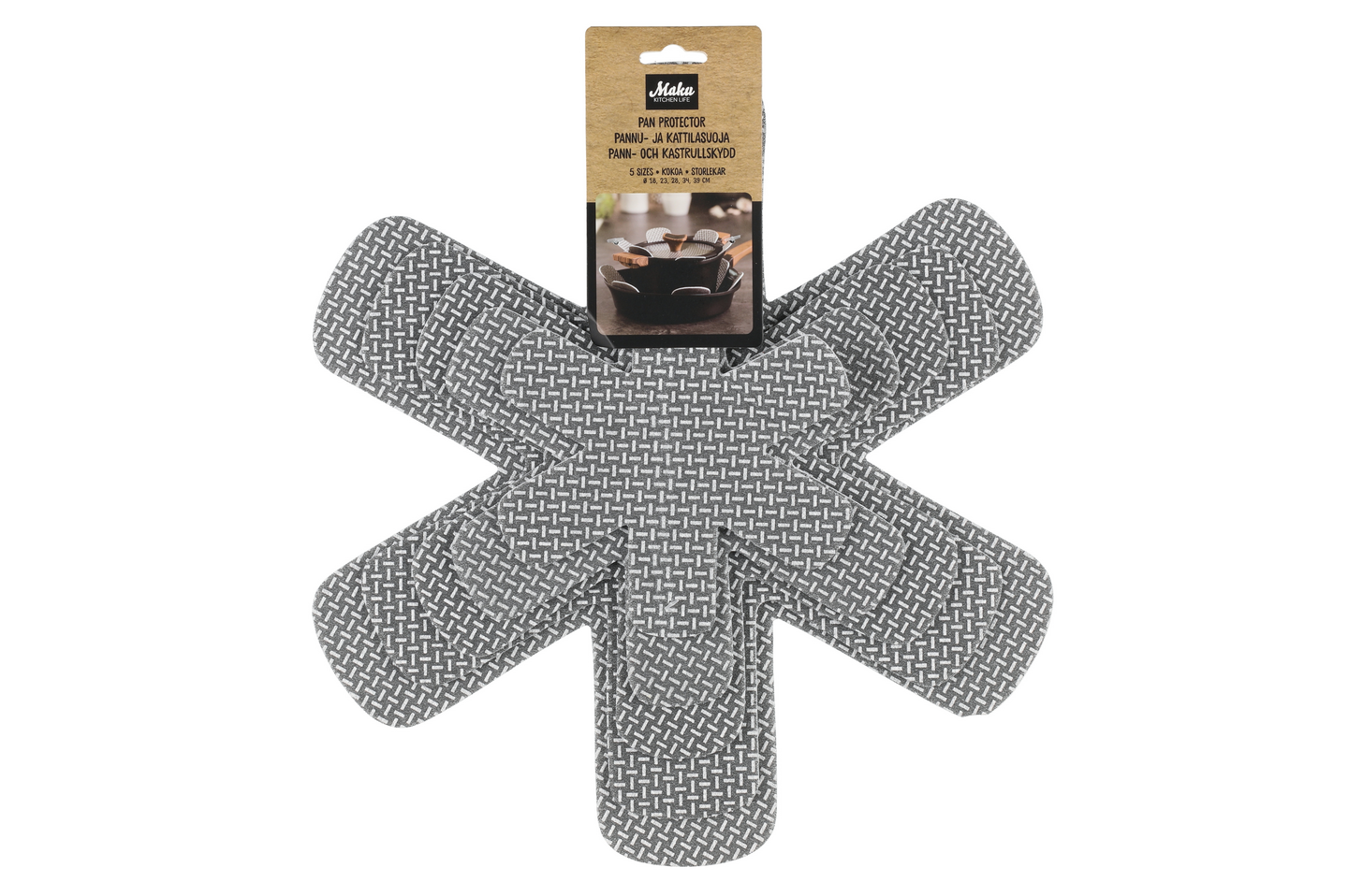 Pannu-ja kattilasuoja estää päällekkäin säilytettävien pannujen ja kattiloiden naarmuuntumisen. Sisältää 5 kpl suojia: koot 18 cm, 23 cm, 28 cm, 34 cm ja 39 cm. Käsinpesu.