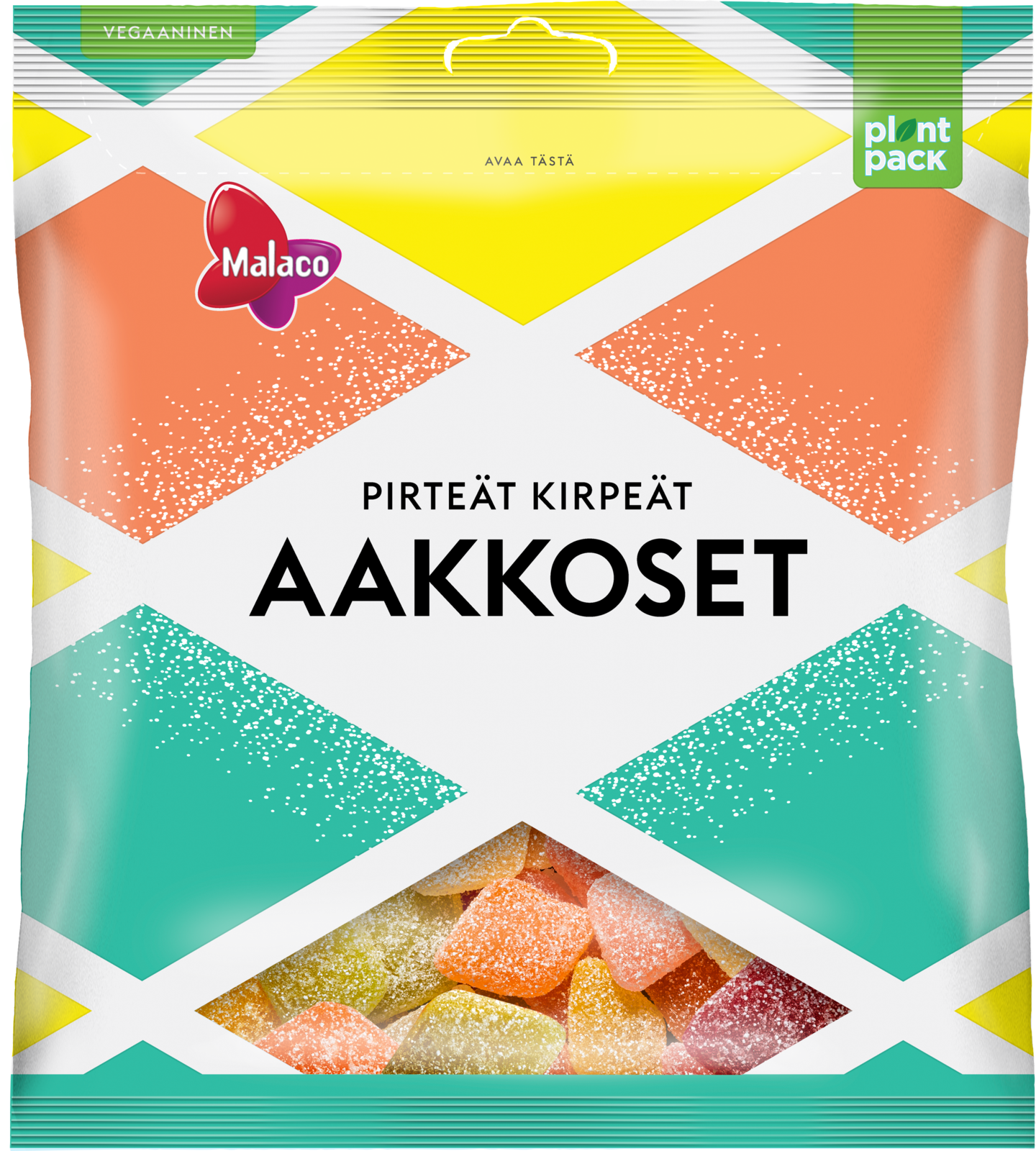 Vegaaniset karkit on pakattu pussiin, joka on valmistettu 50 % kasvipohjaisesta muovista. Lisätietoja cloetta.com/plantpack