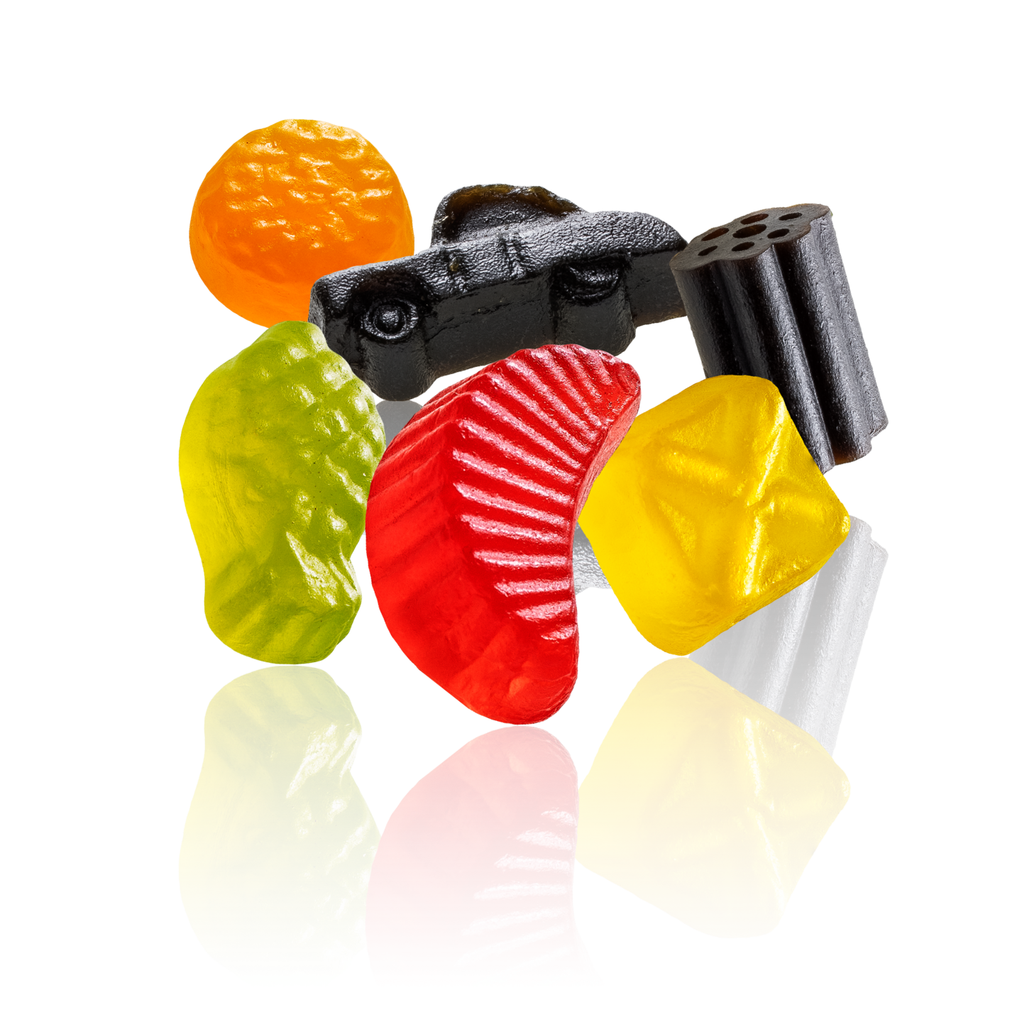 sokeria, glukoosisiirappia, glukoosi-fruktoosisiirappia, tärkkelystä, VEHNÄJAUHOA, muunnettua tärkkelystä, ammoniumkloridia (=salmiakkia), melassia, happoa (E270), lakritsiuutetta, kosteudensäilyttäjiä (sorbitolia, glyserolia), kasviöljyjä (kookos, rapsi), aromeja, suolaa, värejä (E153, E160c, E100, E141), tiivisteitä (mustaviinimarjaa, porkkanaa), pintakäsittelyainetta (karnaubavahaa), stabilointiainetta (E471), kookosrasvaa.