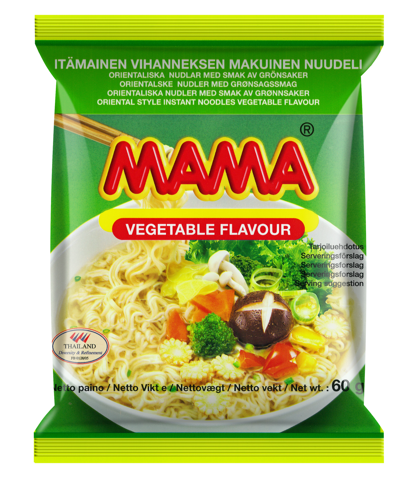 VegaaninenMama-nuudelit valmistetaan Thaimaassa, missä tuotanto alkoi jo 50 vuotta sitten. Mama-nuudelit ovat Thaimaassa markkinajohtajan asemassa ja sieltä ei juurikaan paikkaa löydy, missä Mama-nuudeleita ei olisi tarjolla. Mama-nuudeleita voit löytää ympäri maailman.