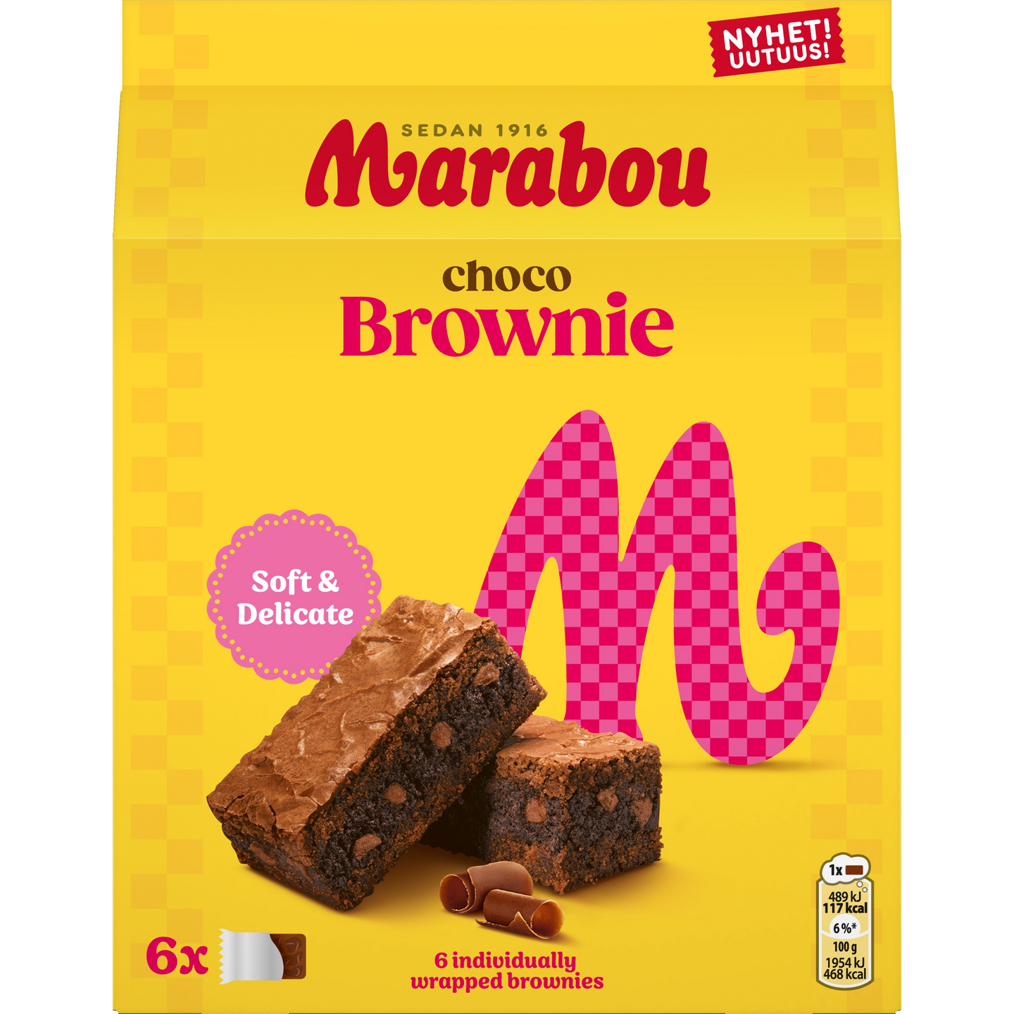 Marabou Choco Brownie - Tämä mehevä, suklaapaloja sisältävä brownie tuo päivääsi täyteläisen suklaista herkullisuutta! Suklaabrownie on täydellinen herkku omaan kahvihetkeen. Pakkaus sisältää 6 kpl yksittäispakattua palaa, jotka säilyvät tuoreina pakkauksen avaamisen jälkeen ja ovat käteviä kerta-annoksia myös mukaan otettavaksi. Mmm...Marabou!