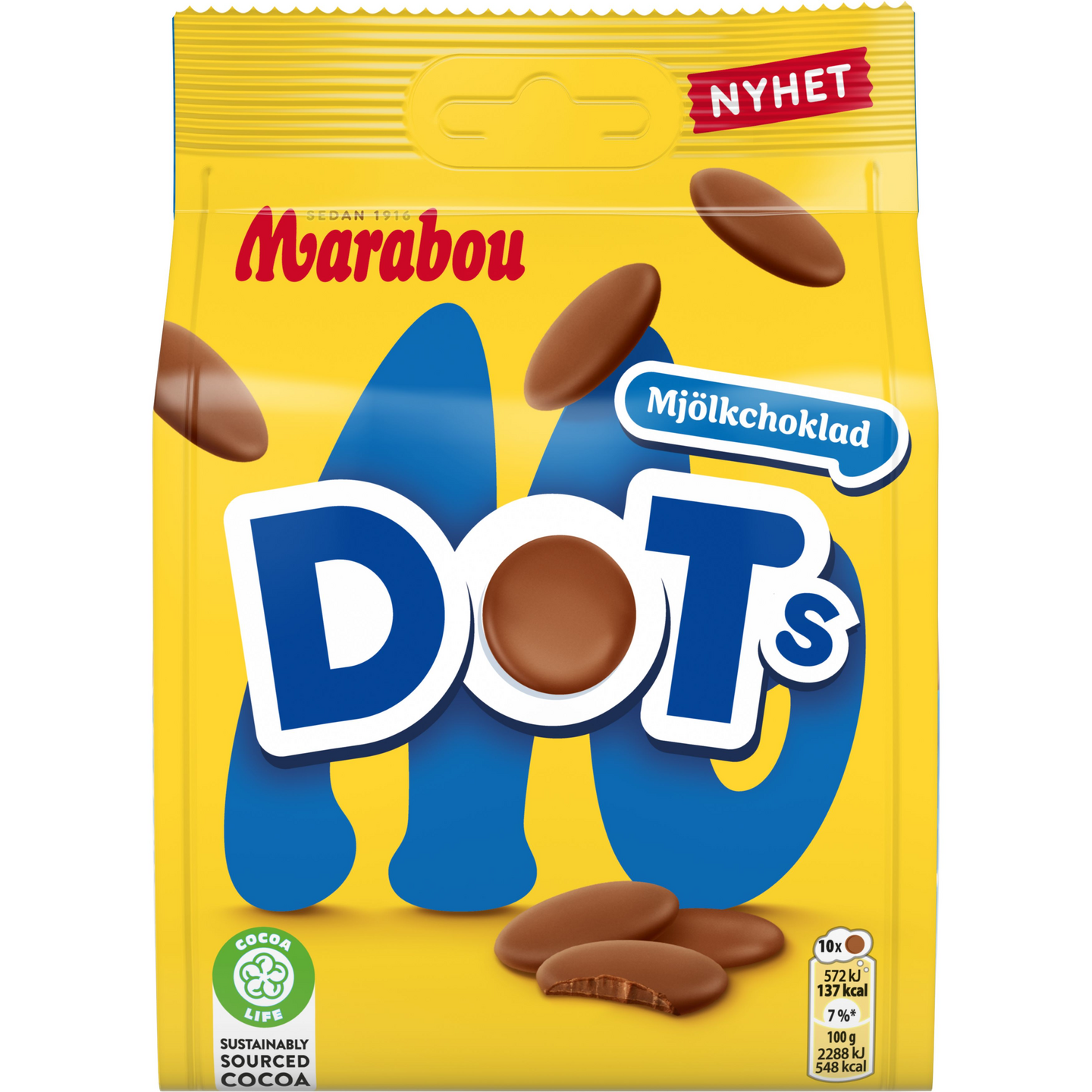 Marabou Dots - Hurmaavat ja helposti herkuteltavat Marabou maitosuklaanapit napostelun ja suklaan rakastajalle! Marabou on Ruotsissa vuonna 1916 perustettu suklaatuotemerkki, jonka tuotteet ovat jo sukupolvien ajan tuoneet iloa ja herkullisuutta perheiden arkeen ja juhlaan. Jaa Marabou Dots -suklaamakeispussi perheen ja ystävien kesken tai käytä lempileivonnaistesi koristeluun! Kaikki Marabou suklaat ovat vastuullisesti Cocoa Life -tuotettuja. Cocoa Life on oma maailmanlaajuinen vastuullisuusohjelmamme.