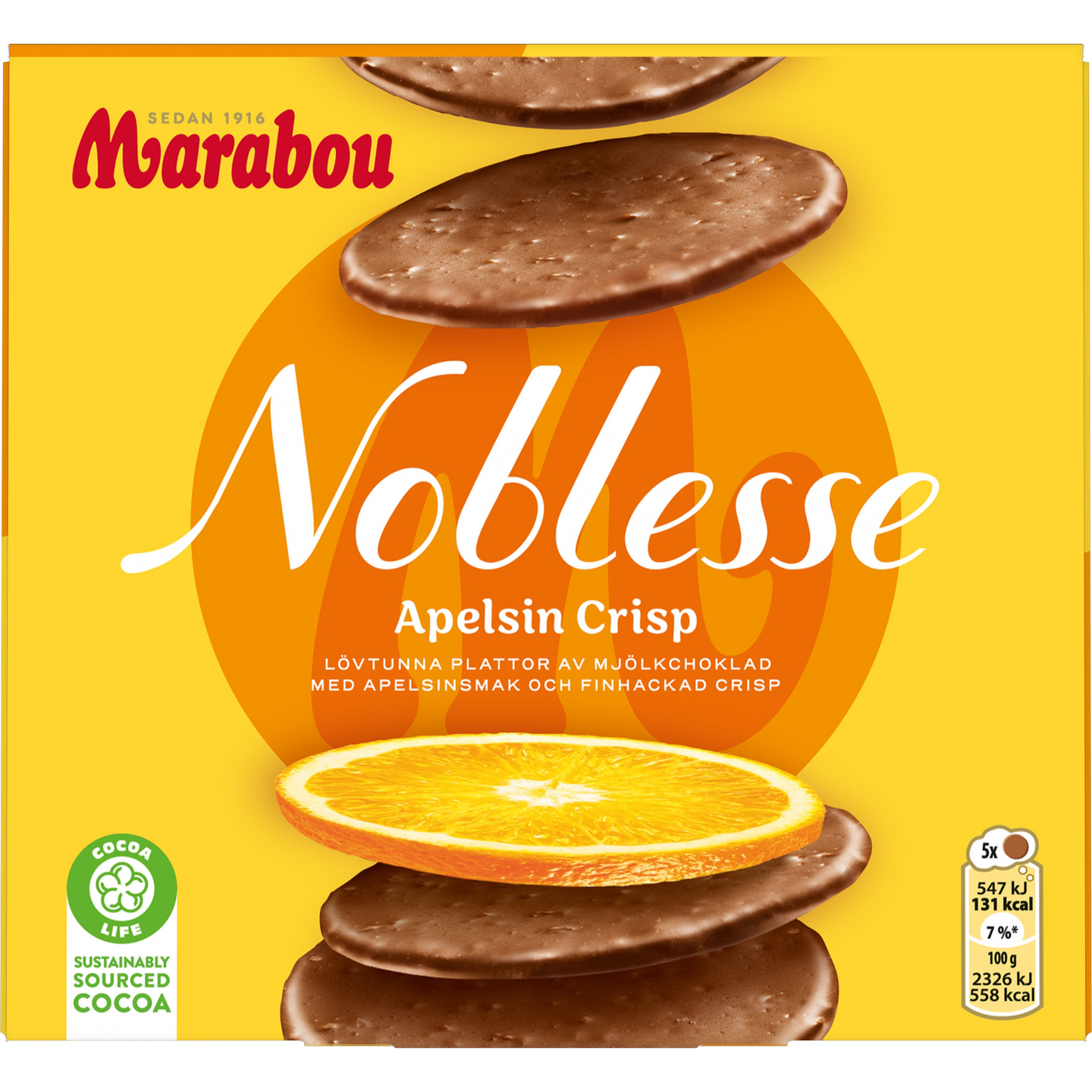 Noblesse Apelsin suklaakonvehtirasia - Rapean ohuet suklaakiekot raikkaalla appelsiinin maulla sulavat suuhun! Marabou Noblesse Apelsin on niin herkullinen ja ohut herkku, että voit hemmotella itseäsi monella. Appelsiinin raikkaat suklaakiekot sopivat erinomaisesti herkuttelu hetkeen, leivonnaisten koristeluun tai lahjaksi ilahduttamaan. Kaikki Marabou suklaat ovat 100% vastuullisesti Cocoa Life -tuotettuja. Cocoa Life on oma maailmanlaajuinen vastuullisuusohjelmamme.