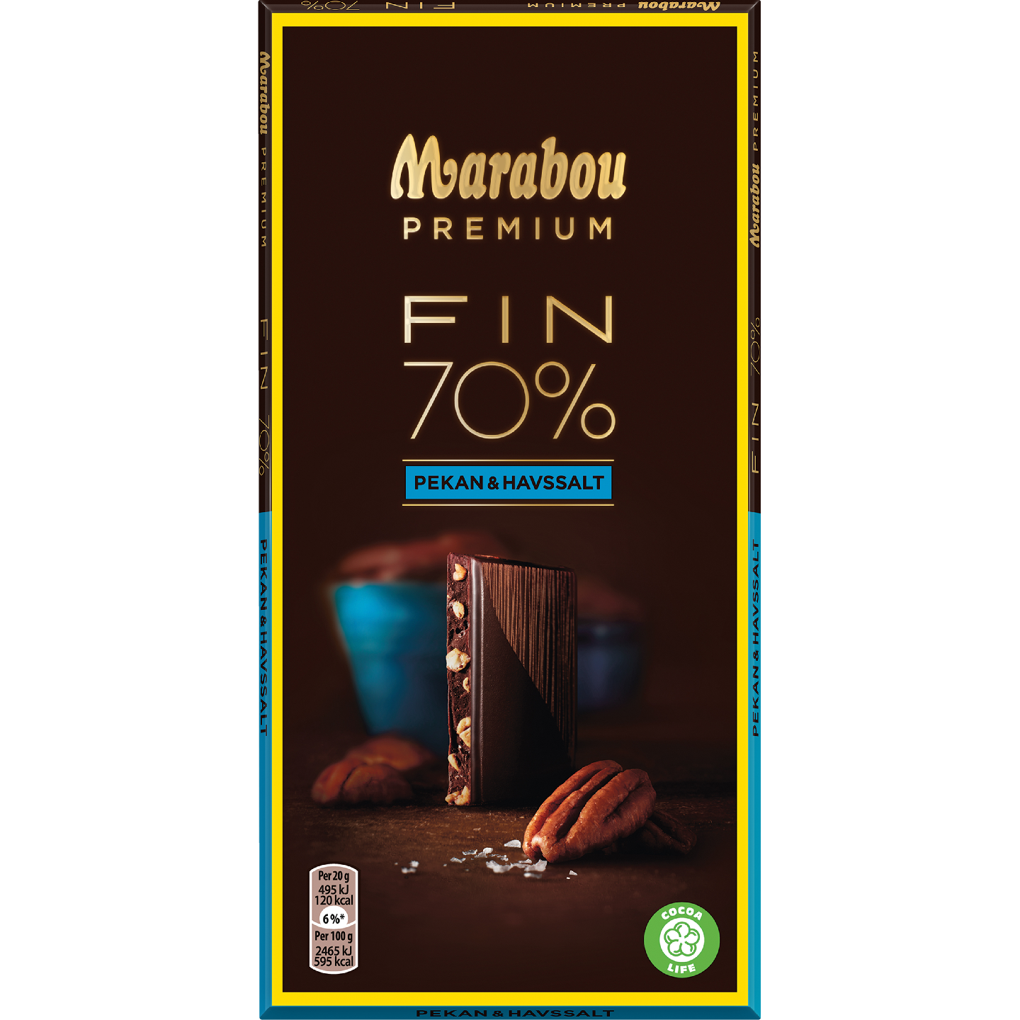 Marabou Premium Fin 70% Pekan & Havssalt - Tumma suklaalevy, jossa on 70% kaakaota ja maistuvia pekaanipähkinän paloja sekä ripaus merisuolaa. Marabou Premium on aidoista ja tarkoin valikoiduista ainesosista valmistettu suklaa todelliseen makuelämykseen. Nauti Marabou Premium suklaasta yksin, yhdessä ystävän tai perheen kanssa. Kaikki Marabou Premium suklaat ovat 100% vastuullisesti Cocoa Life -tuotettuja. Cocoa Life on oma maailmanlaajuinen vastuullisuusohjelmamme.