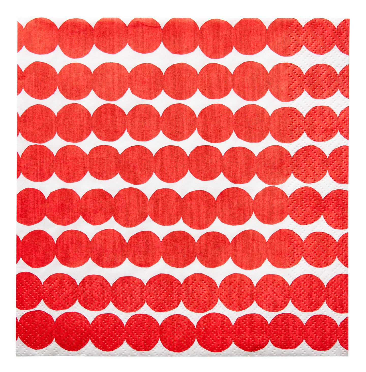 Klassiset Marimekon Räsymatto lautasliinat joulunpunaisessa värityksessä. Kuosin on suunnitellut Maija Louekari vuonna 2009. Kotimaiset lautasliinat ovat Havin valmistamat ja ne ovat painettu Imatralla 3-kertaiselle pehmopaperille. Lautasliinoille on myönnetty Avainlippu, Joutsenmerkki ja FSC.