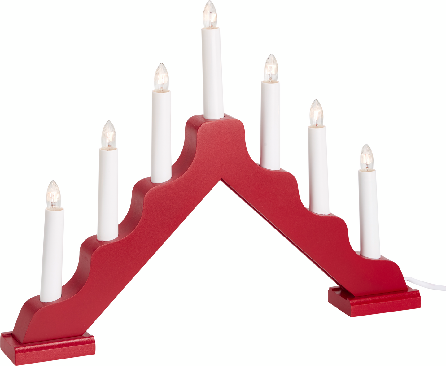 Sisäkäyttöön sopiva punainen 7-haarainen kynttelikkö, jossa on valkoiset kynttilät. Kynttelikössä on hillitty koristeellinen muotoilu. Kynttelikön korkeus on 30 cm ja leveys 40 cm.