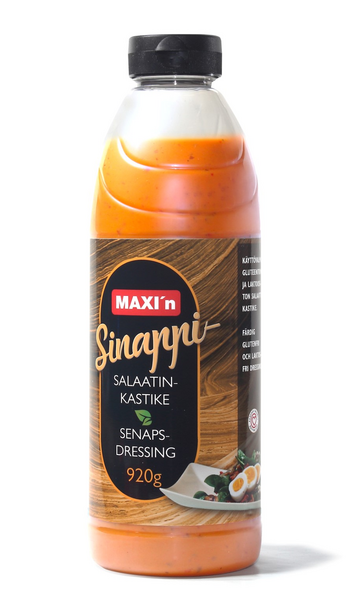Vesi, rapsiöljy, SINAPPI 13,2% (vesi, SINAPINSIEMEN, sokeri, happamuudensäätöaine (etikkahappo), suola), glukoosi-fruktoosisiirappi, sokeri, väkiviinaetikka, suola, mausteet (valkosipuli, mustapippuri, valkopippuri, rakuuna), tomaattipyree, sitruunamehutiiviste, sakeuttamisaine (propyleeniglykolialginaatti), sokerisiirappi, säolöntäaine (kaliumsorbaatti), happamuudensäätöaine (sitruunahappo).