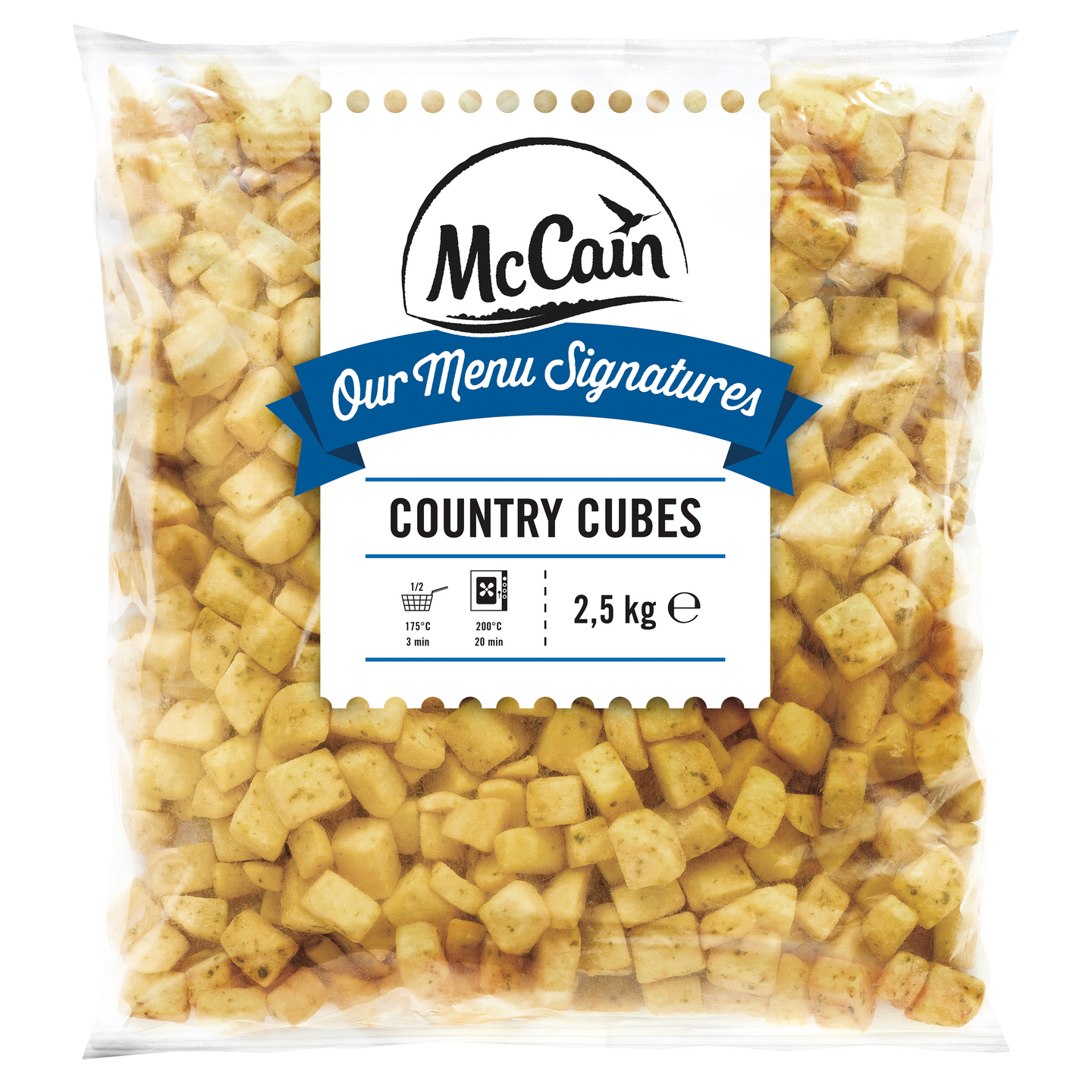 LaktoositonPotato cubes with a crisp garlic and herb coating. Prefried and quick frozen