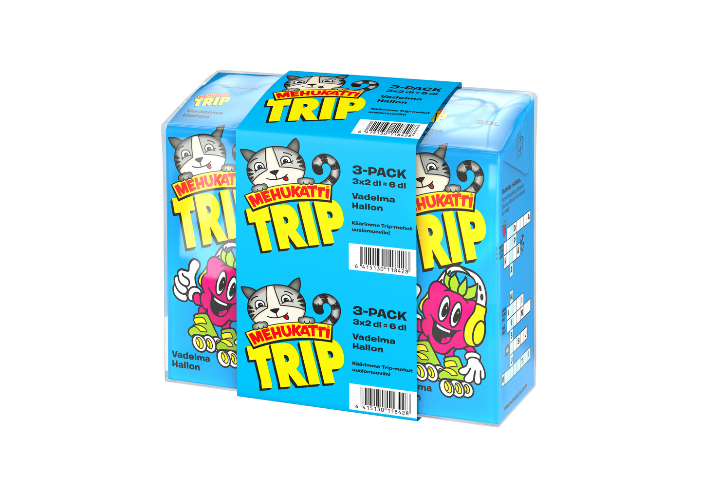 VegaaninenKätevät Mehukatti Trip 3-packit on helppo kuljettaa kotiin, napata mukaan retkelle tai mökille sekä tarjoilla janoisille vieraille lastenjuhlissa.