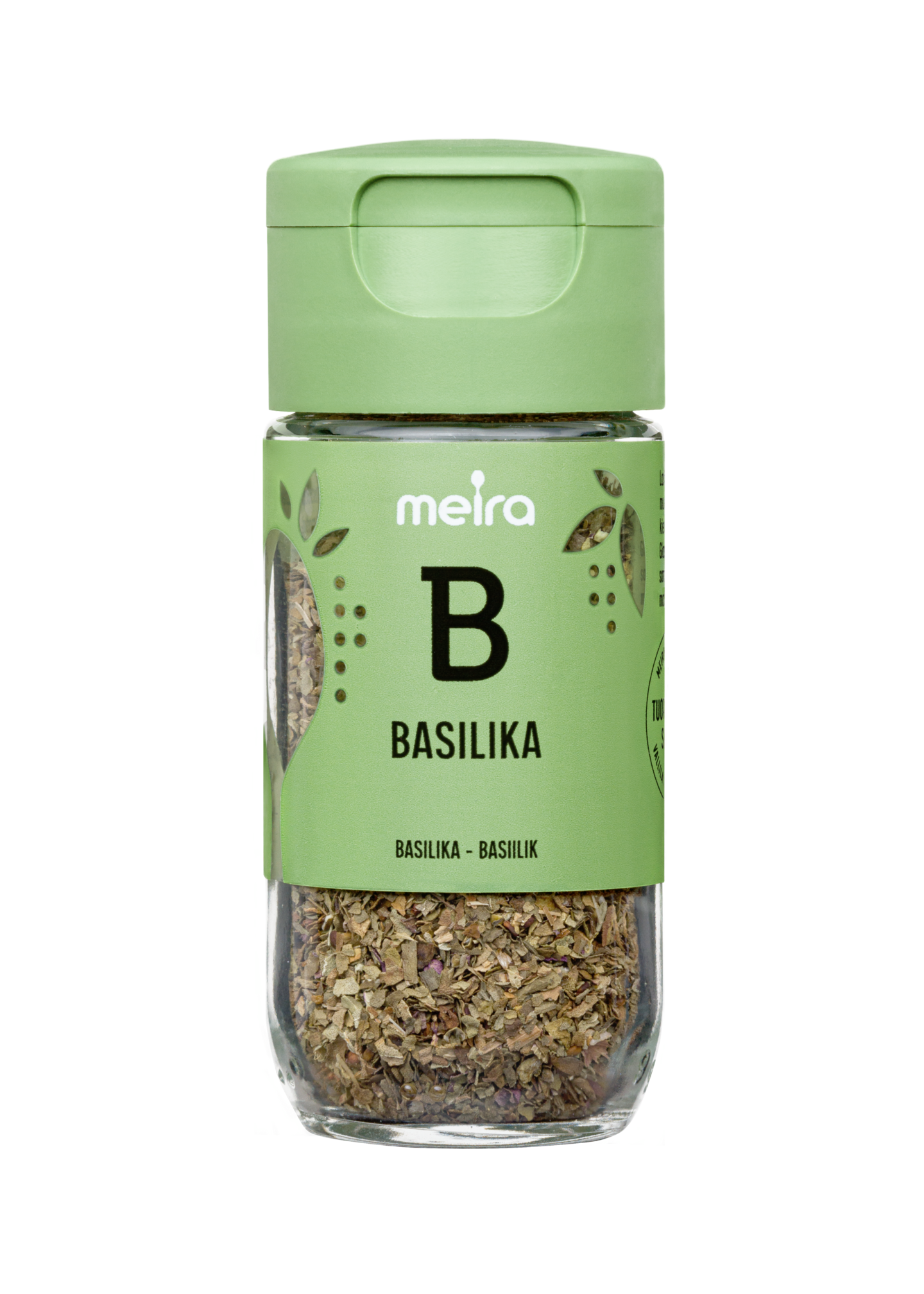 Basilika on hyvälle tuoksuva ja miedon makuinen yrtti. Se sopii tomaatin sekä muiden kasvisten, keittojen, pasta- ja jauheliharuokien, salaattien ja pizzojen maustamiseen. Meiran laatutakuu: Meiran mausteet ovat aina tuoreimmasta sadosta, jolloin kaikki luonnolliset makuaromit ja tuoksut ovat tallella.