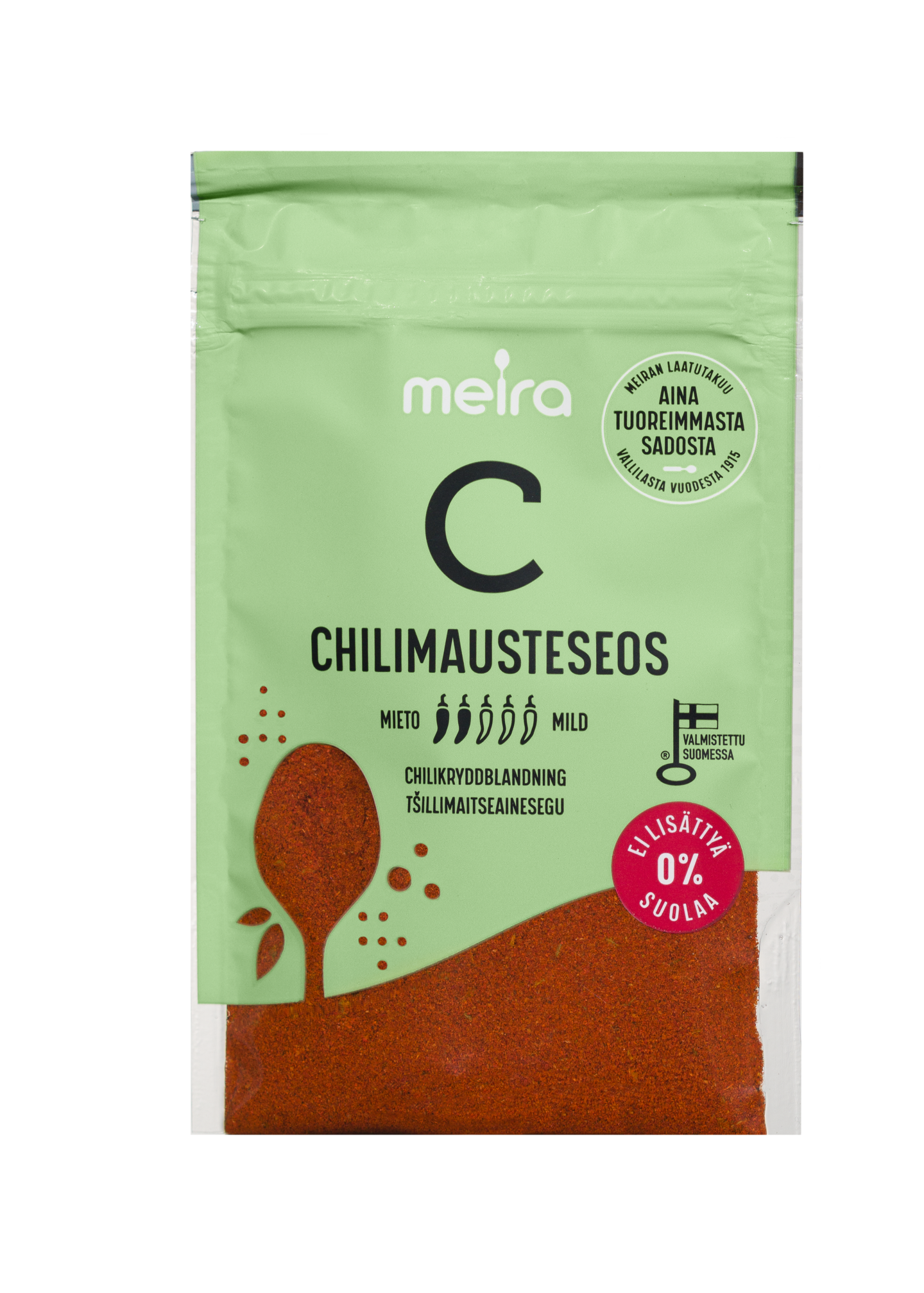 Meira Chilimausteseos on maultaan täyteläinen ja tulisuudeltaan pehmeä (n. 1 000 SHU) mausteseos monenlaisiin ruokiin. Chilimausteseos antaa ruokaan sopivasti poltetta ja runsaasti makua. Meiran laatutakuu: Meiran mausteet ovat aina tuoreimmasta sadosta, jolloin kaikki luonnolliset makuaromit ja tuoksut ovat tallella.