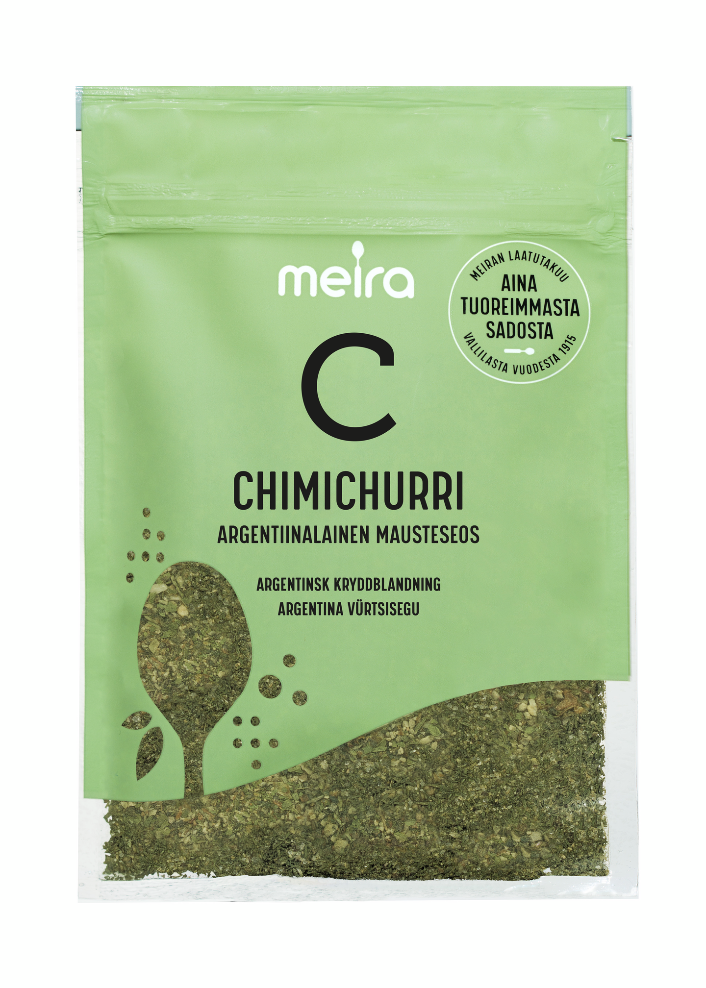 Chimichurri on monipuolinen, argentiinalainen mausteseos, jota voit käyttää sekä maustamiseen että kastikkeena liha-, kala- ja kasvisruokiin. Chimichurrista saat öljyyn sekoitettuna herkullisen marinadin tai kastikkeen esim. grilliruuan, salaatin tai perunoiden kanssa nautittavaksi. Kastikkeen valmistusohje: sekoita 0,5 dl Meira Chimichurri -mausteseosta ja 0,5 dl vettä. Anna maustua 10 minuuttia. Lisää lopuksi 0,75 dl öljyä ja sekoita. Lisää käyttövinkkejä meira.fi. Meiran laatutakuu: Meiran mausteet ovat aina tuoreimmasta sadosta, jolloin kaikki luonnolliset makuaromit ja tuoksut ovat tallella.