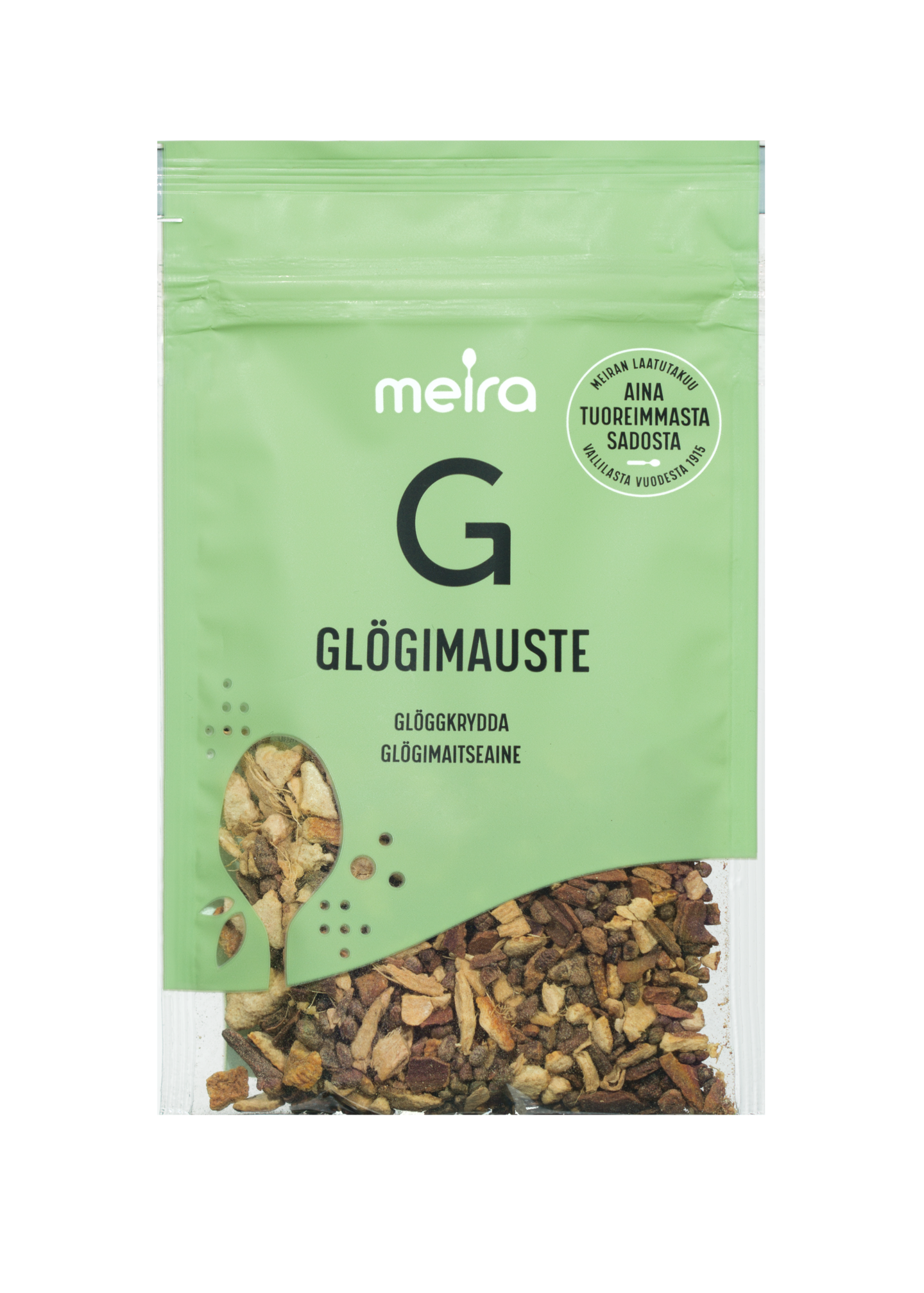 VegaaninenPerinteisen Meira glögimausteen avulla saat valmistettua talven sesonkiin glögiä tai vaikka jouluista rusinasoppaa. Glögimauste sisältää tuttuja jouluisia mausteita kuten kanelia, kardemummaa, inkivääriä ja neilikkaa. Meiran glögimausteessa maistuvat aidot joulun mausteet, jotka on aina poimittu tuoreimmasta sadosta.