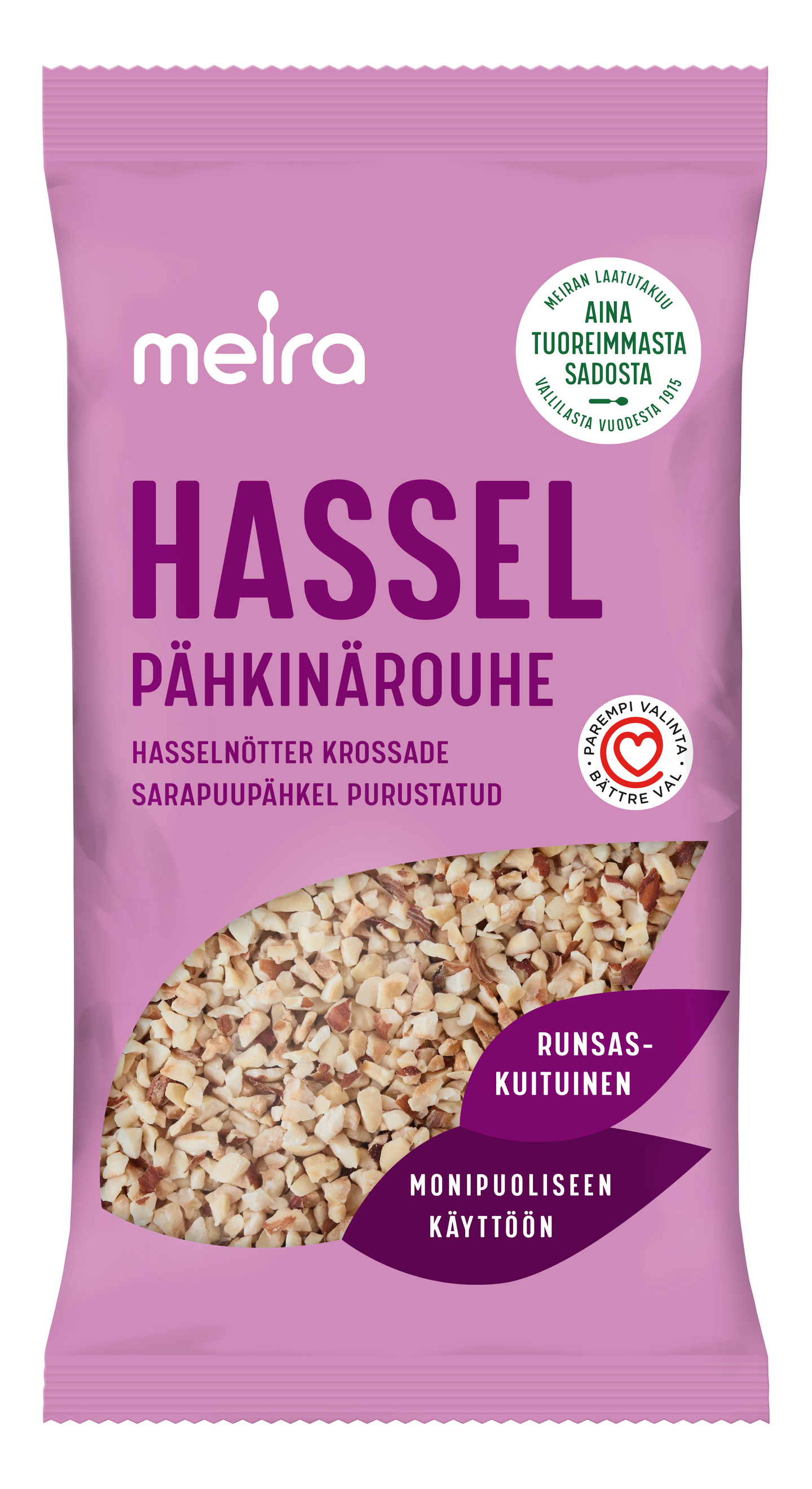 Hasselpähkinärouhe sopii hyvin leivonnaisiin, jälkiruokiin ja salaatteihin. Hasselpähkinärouhetta voi lisätä myös esimerkiksi myslin, puuron, juomien tai jogurtin sekaan. Hasselpähkinärouhe sisältää paljon kuitua ja on hyvä tyydyttymättömän rasvan lähde. Huolella valikoidut Meira pähkinätuotteet pakataan Suomessa.