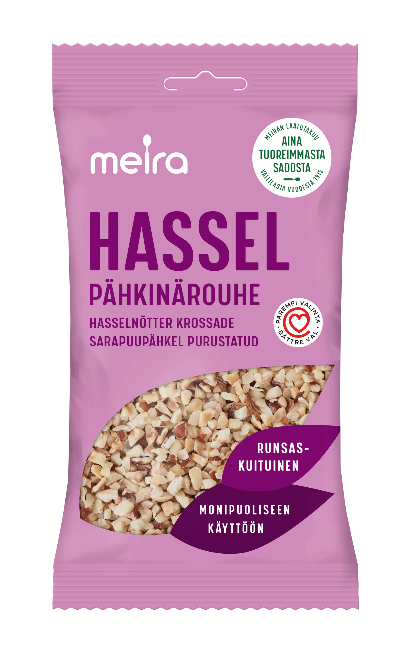 Hasselpähkinärouhe sopii hyvin leivonnaisiin, jälkiruokiin ja salaatteihin. Hasselpähkinärouhetta voi lisätä myös esimerkiksi myslin, puuron, juomien tai jogurtin sekaan. Hasselpähkinärouhe sisältää paljon kuitua ja on hyvä tyydyttymättömän rasvan lähde. Huolella valikoidut Meira pähkinätuotteet pakataan Suomessa.