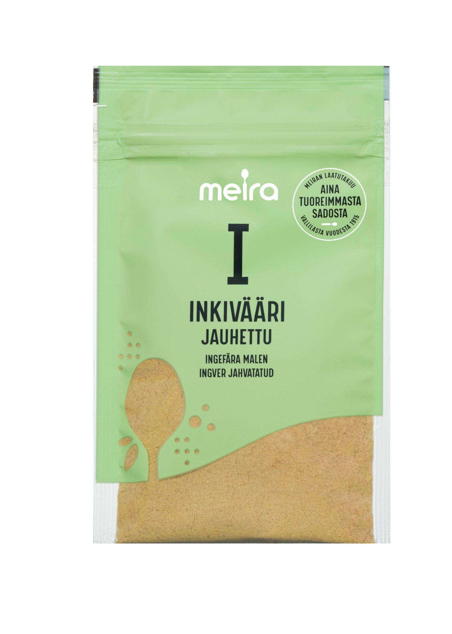 Jauhettua inkivääriä käytetään piparkakkujen, maustekakkujen, omenaleivonnaisten ja erilaisten ruokien maustamiseen. Se sopii myös ripoteltavaksi viilin pinnalle. Meiran laatutakuu: Meiran mausteet ovat aina tuoreimmasta sadosta, jolloin kaikki luonnolliset makuaromit ja tuoksut ovat tallella.