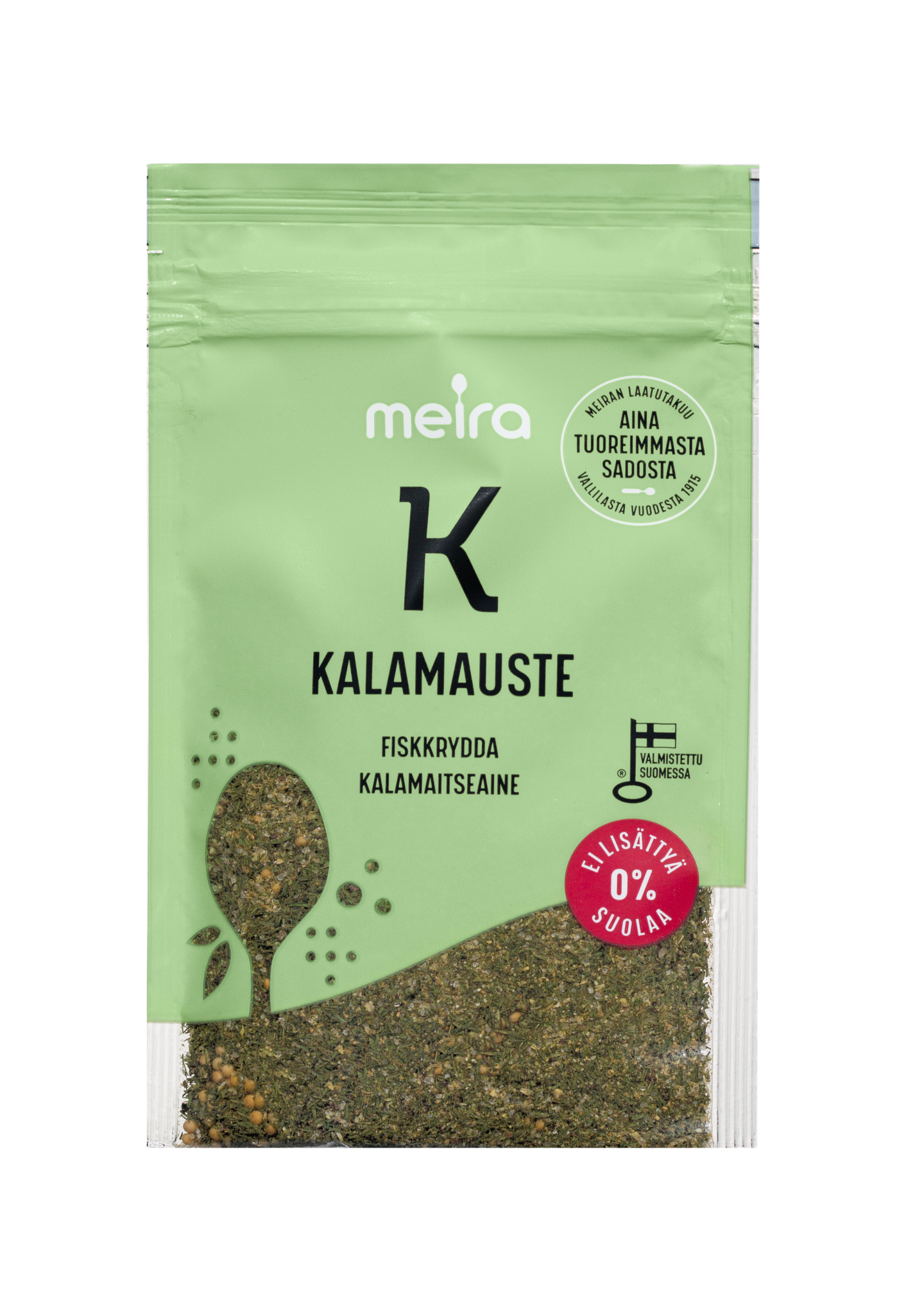 GluteenitonKalamauste on mausteseos erilaisten kalaruokien maustamiseen. Mausteseosta käytetään 1-2 tl puoleen kiloon kalaa. Meiran laatutakuu: Meiran mausteet ovat aina tuoreimmasta sadosta, jolloin kaikki luonnolliset makuaromit ja tuoksut ovat tallella.