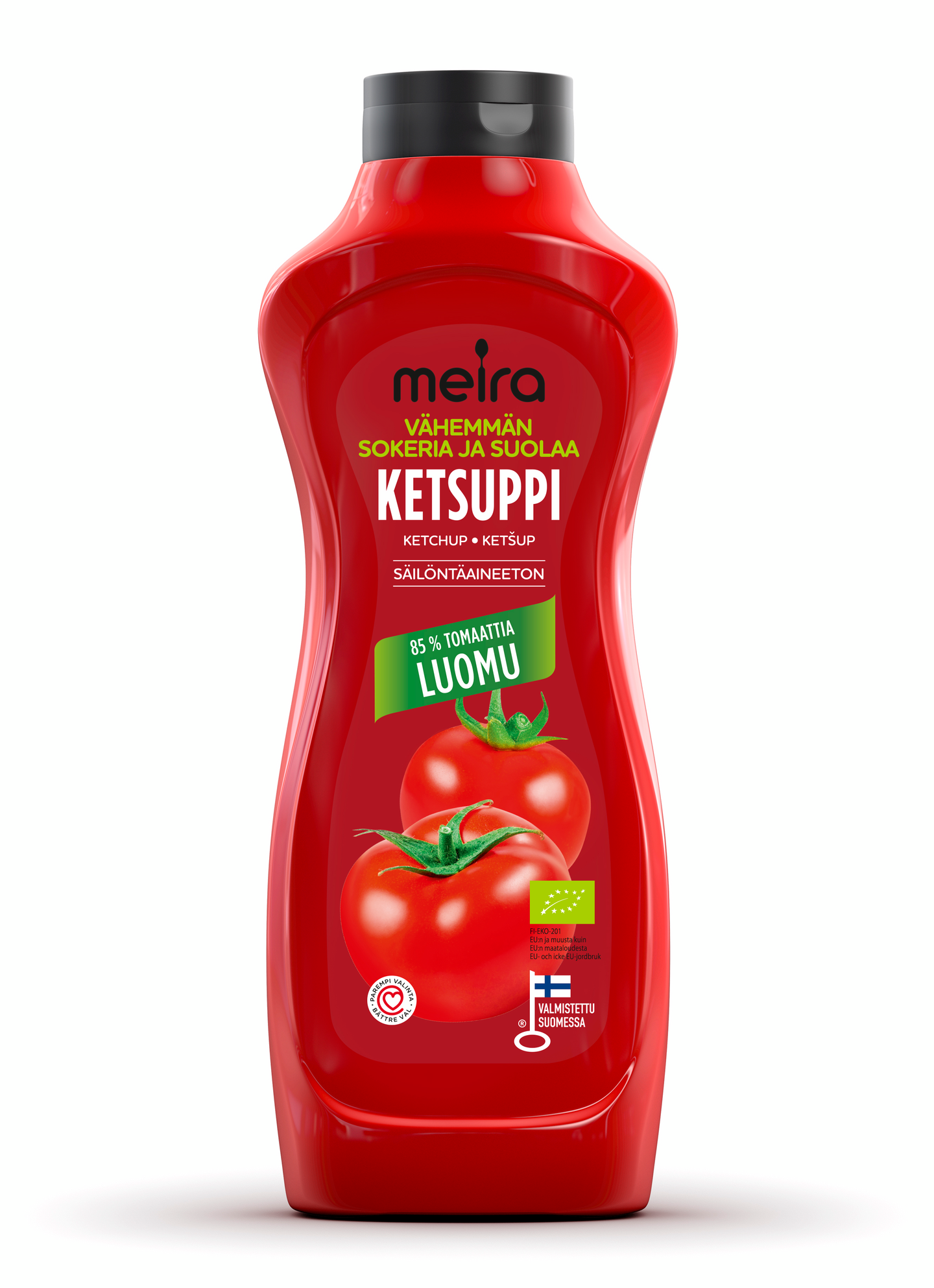 Meira Luomu Ketsuppi vähemmän sokeria ja suolaa on valmistettu runsaasta määrästä tomaatteja. Sen tomaattipitoisuus on 85 %, joka on luomuketsuppien korkein. Ketsuppi ei sisällä lainkaan säilöntäaineita. Tuotteessa käytetty suola on jodioitua. Suomessa kehitetty ja valmistettu hyödyntäen biokaasua. Meira Luomu Ketsuppi on merkitty suomalaisella Avainlippu-tunnuksella, ja lisäksi se on saanut Suomen Sydänliiton Sydänmerkin.