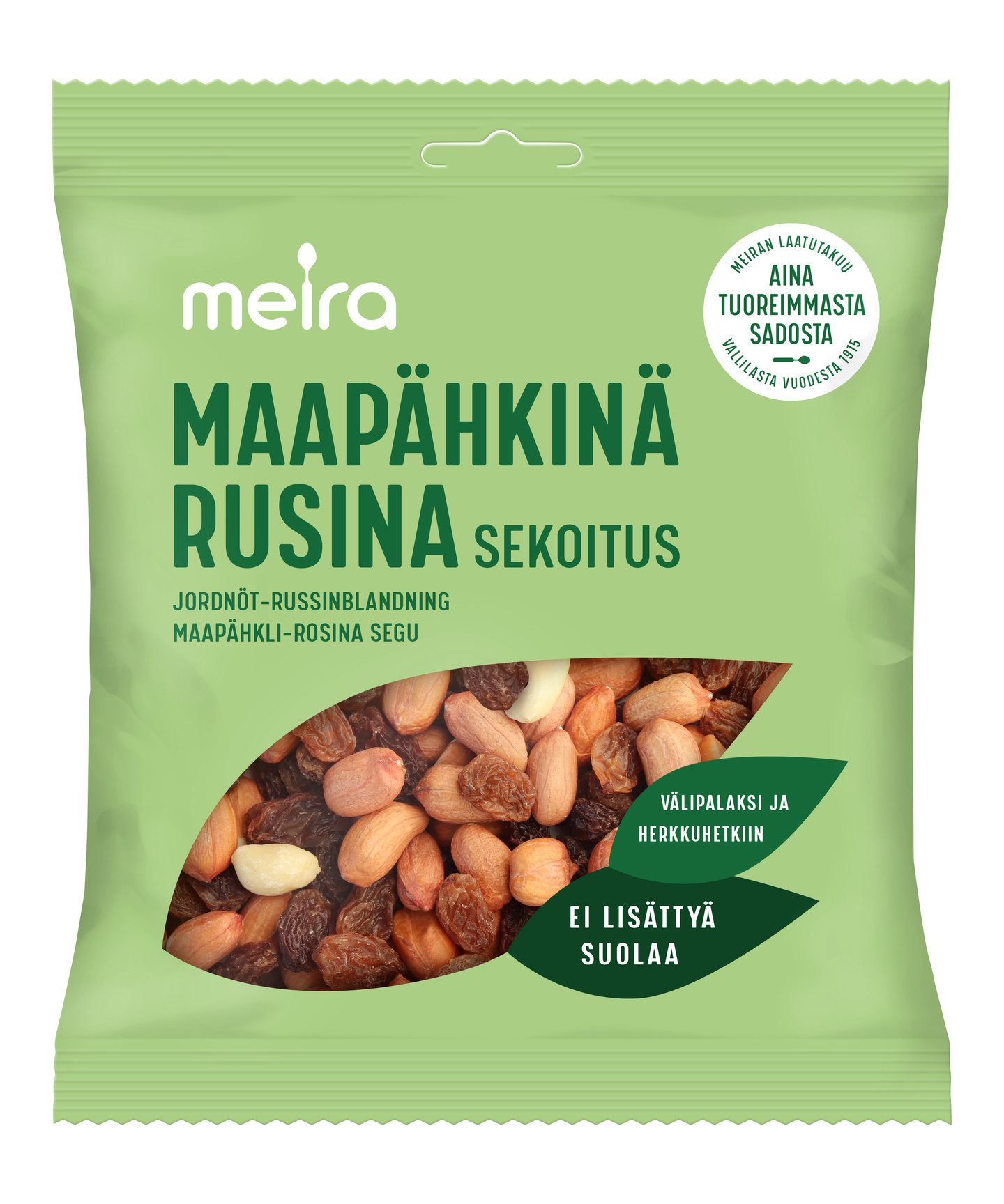 Maapähkinä-rusinasekoitus on maukas naposteltava ja mainio välipalasekoitus. Se sopii hyvin myös erilaisiin leivonnaisiin. Maapähkinä-rusinasekoitus on proteiinipitoinen ja runsaskuituinen sekä hyvä tyydyttymättömän rasvan lähde. Meira Maapähkinä-rusinasekoitus ei sisällä lisättyä suolaa. Huolella valikoidut Meira pähkinätuotteet pakataan Suomessa.