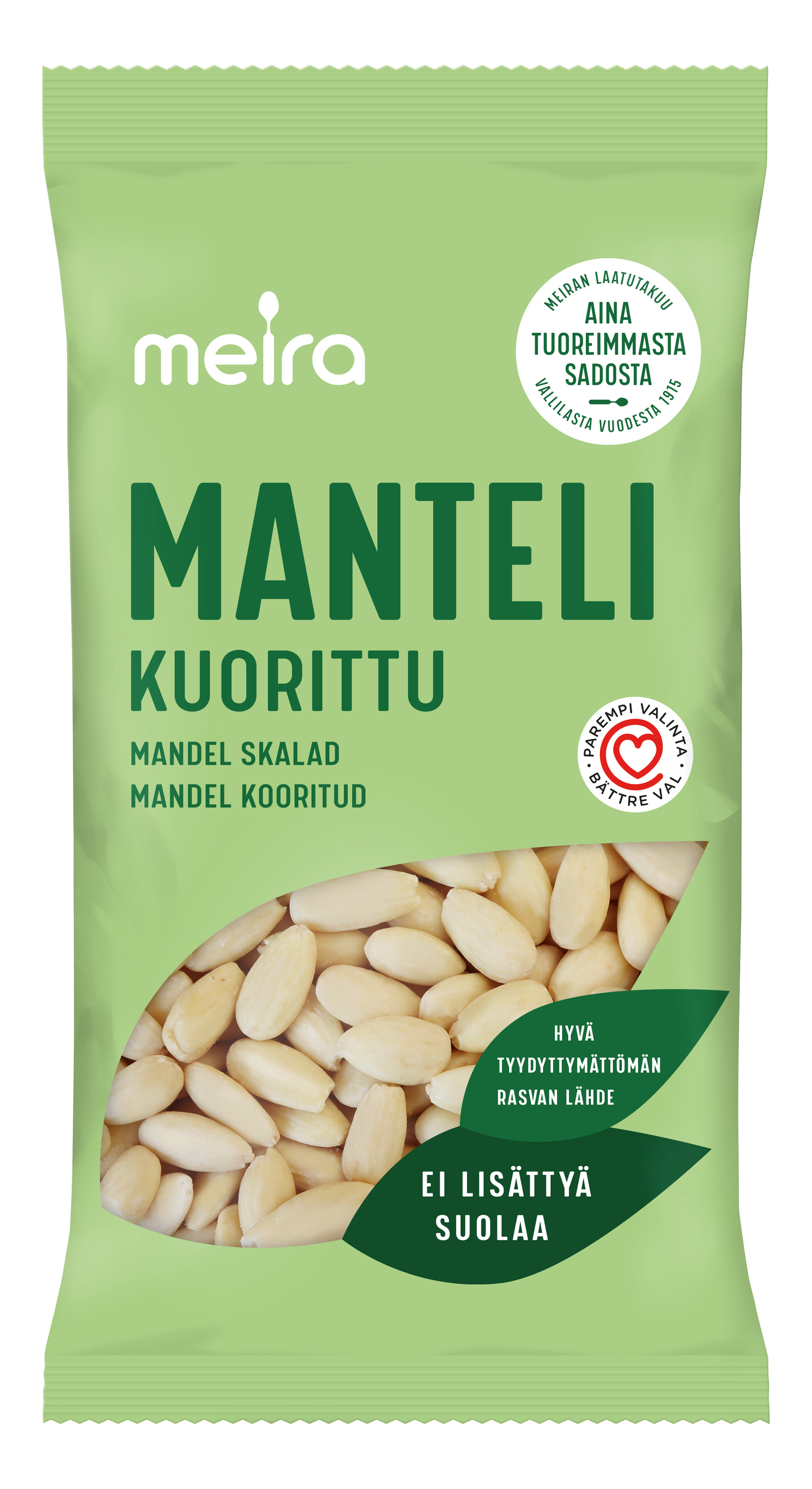 Manteli on mainio välipala- ja napostelupähkinä. Se sopii hyvin myös makeisiin ja suolaisiin leivonnaisiin sekä erilaisiin salaatteihin ja pataruokiin. Manteli on runsaskuituinen, proteiinipitoinen ja hyvä tyydyttymättömän rasvan lähde. Meira Manteli ei sisällä lisättyä suolaa. Huolella valikoidut Meira mantelit pakataan Suomessa.
