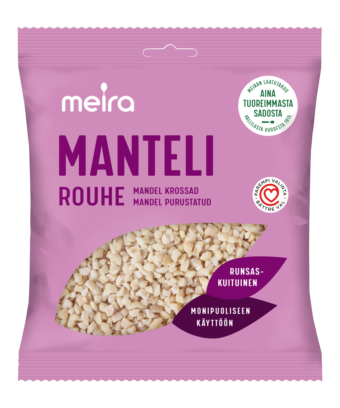 Mantelirouhe sopii kaikenlaisiin leipä- ja kakkutaikinoihin sekä muihin makeisiin ja suolaisiin leivonnaisiin. Mantelirouhetta voi lisätä myös esimerkiksi myslin, puuron, juomien tai jogurtin sekaan. Mantelirouhe sisältää paljon kuitua ja on hyvä tyydyttymättömän rasvan lähde. Huolella valikoidut Meira pähkinätuotteet pakataan Suomessa.