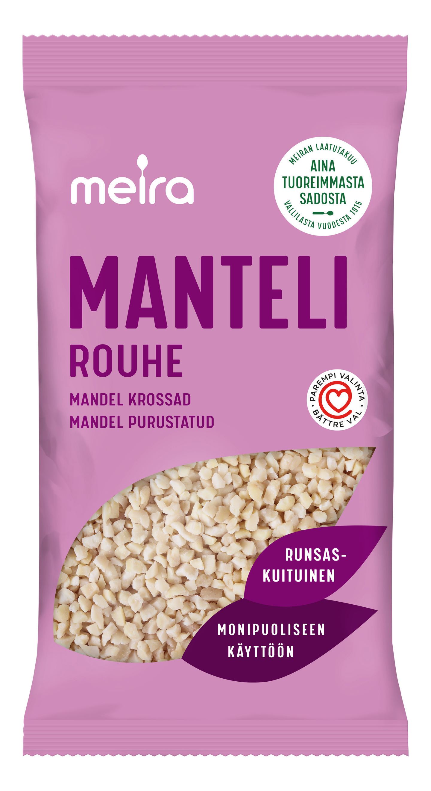 Mantelirouhe sopii kaikenlaisiin leipä- ja kakkutaikinoihin sekä muihin makeisiin ja suolaisiin leivonnaisiin. Mantelirouhetta voi lisätä myös esimerkiksi myslin, puuron, juomien tai jogurtin sekaan. Mantelirouhe sisältää paljon kuitua ja on hyvä tyydyttymättömän rasvan lähde. Huolella valikoidut Meira pähkinätuotteet pakataan Suomessa.