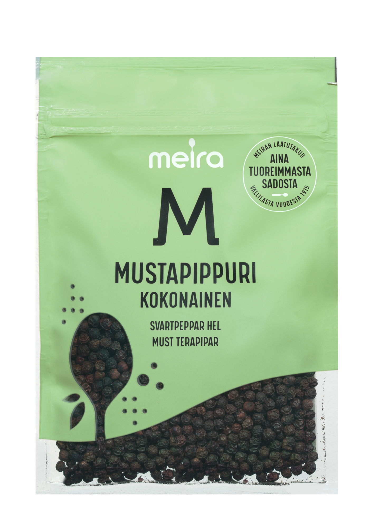 Kokonainen mustapippuri on pippuriköynnöksen puolikypsänä poimittu ja kuivattu marja. Se sopii liha-, kala- ja kasvisruokien maustamiseen. Meiran laatutakuu: Meiran mausteet ovat aina tuoreimmasta sadosta, jolloin kaikki luonnolliset makuaromit ja tuoksut ovat tallella.