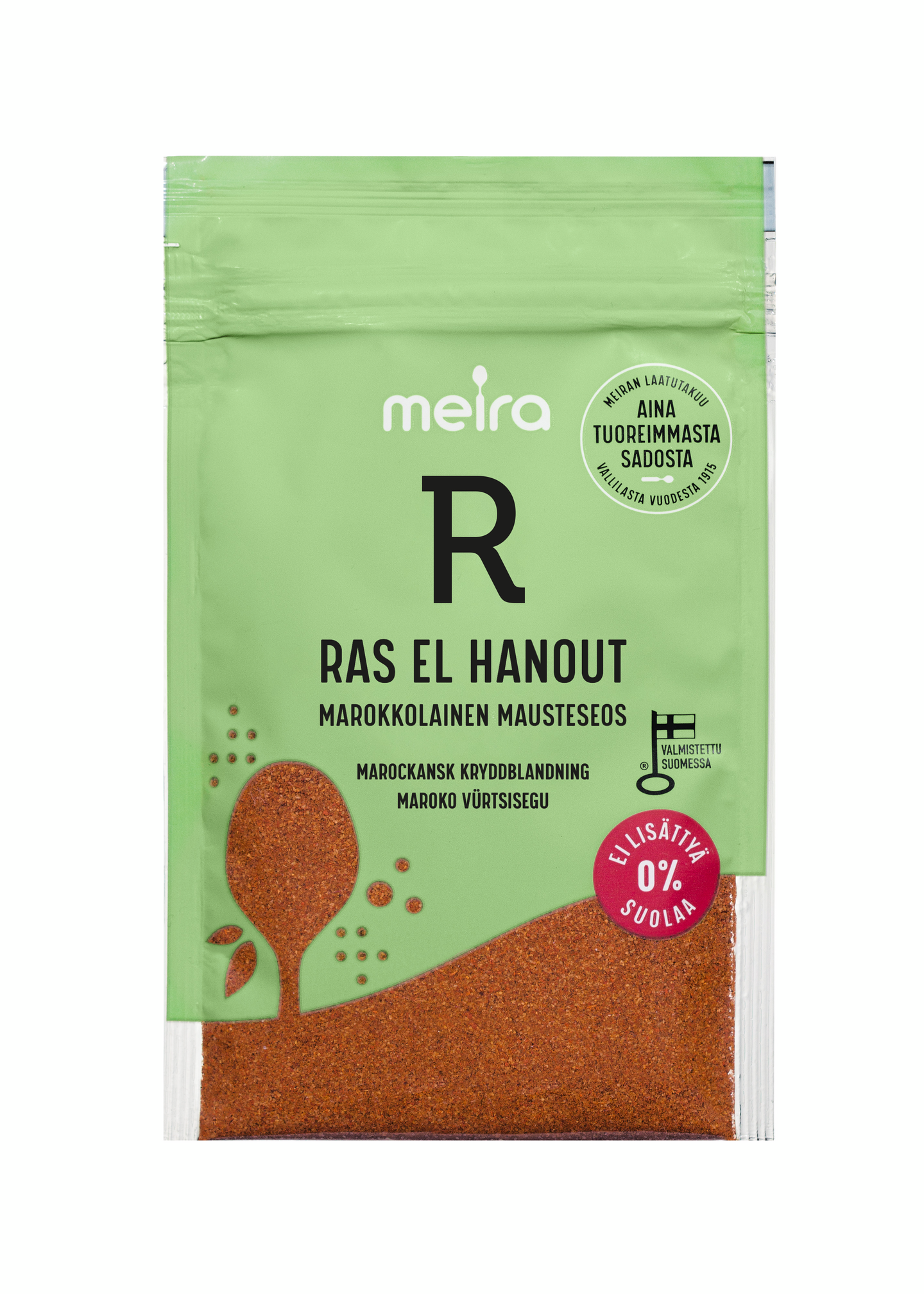 Ras El Hanout on marokkolainen mausteseos, joka antaa aromikkaan täyteläisen maun erilaisiin liha-, kana- ja kasvisruokiin. Mausteseokseen ei ole lisätty suolaa eikä lisäaineita. Hae vaihtelua ja lisää helposti tuttuihin arkiruokiin mukaan marokkolaisia makuvivahteita! Meiran laatutakuu: Meiran mausteet ovat aina tuoreimmasta sadosta, jolloin kaikki luonnolliset makuaromit ja tuoksut ovat tallella.