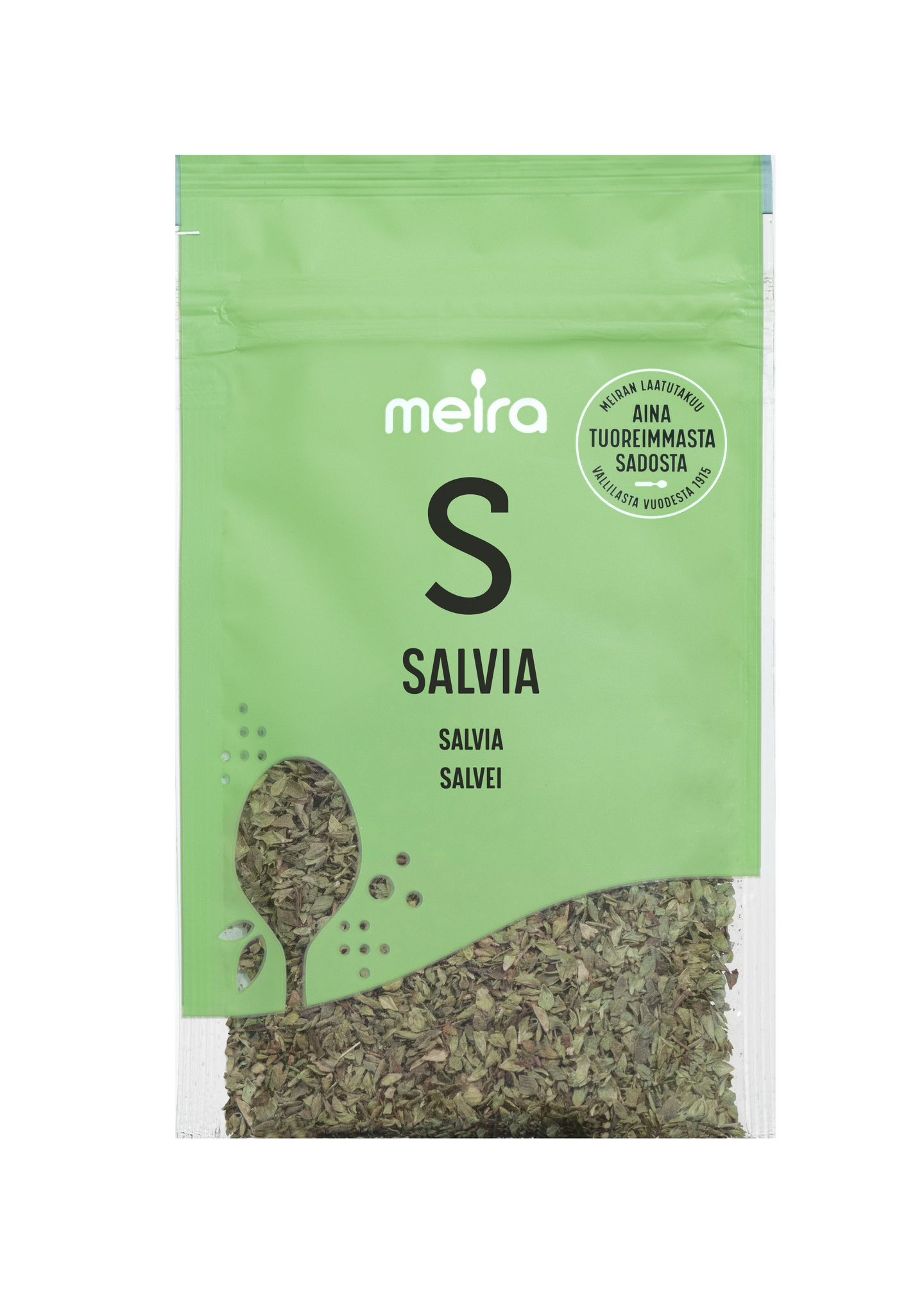 Salvia on melko voimakkaan makuinen yrtti. Se sopii liha-, maksa-, riista-, kasvis- ja sieniruokien maustamiseen. Meiran laatutakuu: Meiran mausteet ovat aina tuoreimmasta sadosta, jolloin kaikki luonnolliset makuaromit ja tuoksut ovat tallella.
