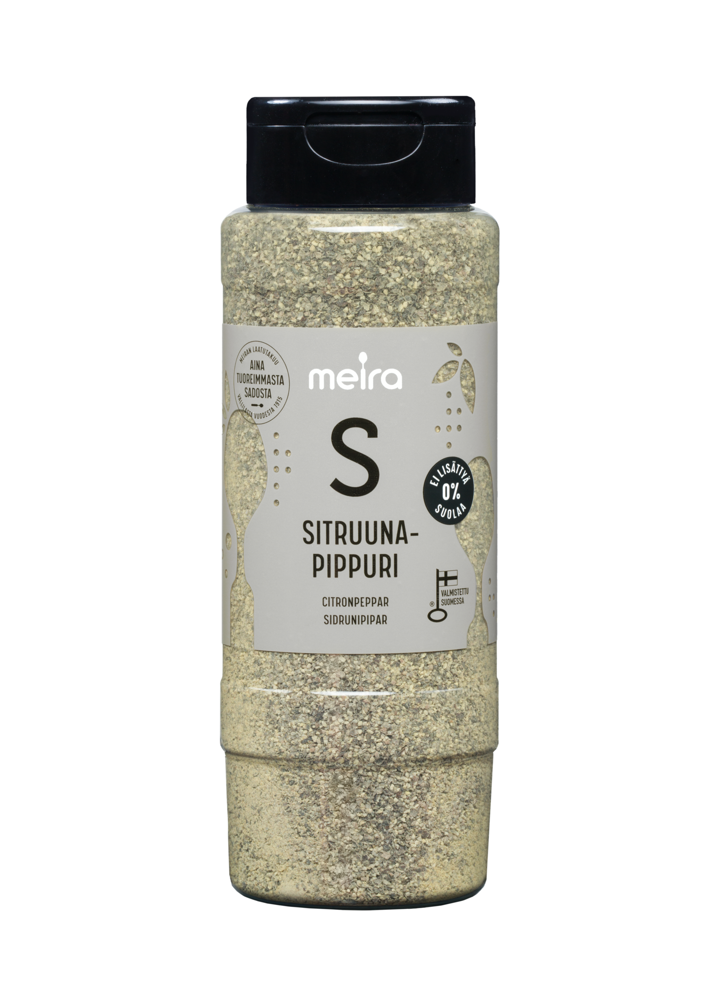 Meira sitruunapippuri on mausteseos, jossa maistuvat sitruuna ja hienoarominen mustapippuri. Sitruunapippuri sopii paistetun ja grillatun kalan, broilerin ja lihan sekä salaattien ja salaatti- kastikkeiden maustamiseen. Meiran laatutakuu: Meiran mausteet ovat aina tuoreimmasta sadosta, jolloin kaikki luonnolliset makuaromit ja tuoksut ovat tallella.