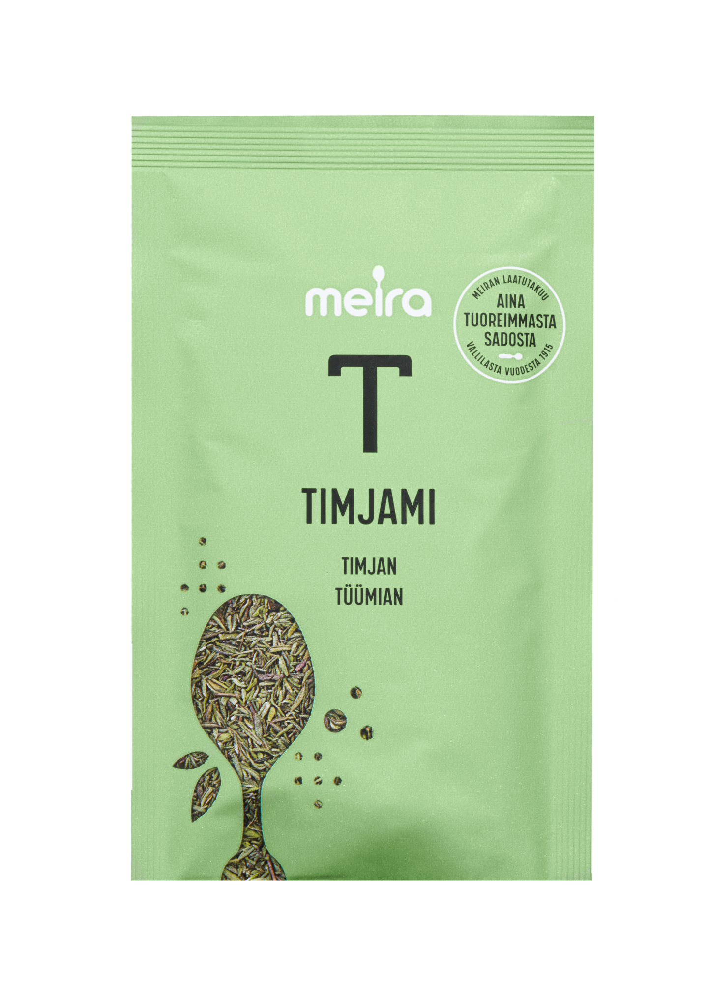 Timjami on melko voimakkaan makuinen yrtti. Se sopii kasvis- ja liharuokien, kalakeiton, äyriäisten ja salaattien maustamiseen. Meiran laatutakuu: Meiran mausteet ovat aina tuoreimmasta sadosta, jolloin kaikki luonnolliset makuaromit ja tuoksut ovat tallella.