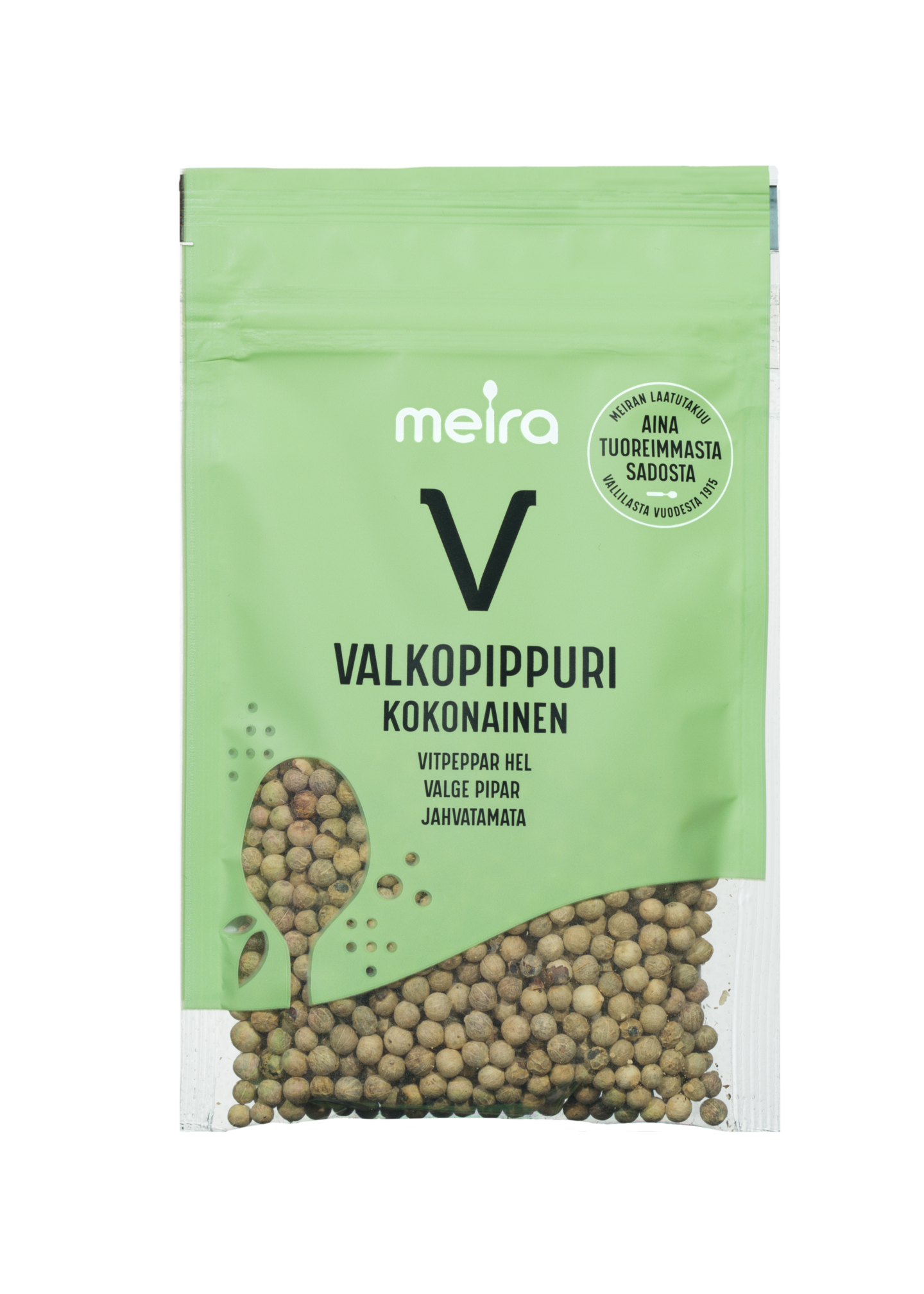 Kokonainen valkopippuri on pippuriköynnöksen kypsänä poimittu, kuorittu ja kuivattu marja. Se sopii haudutettavien kala-, liha- ja kasvisruokien sekä etikkasäilykkeiden maustamiseen. Meiran laatutakuu: Meiran mausteet ovat aina tuoreimmasta sadosta, jolloin kaikki luonnolliset makuaromit ja tuoksut ovat tallella.