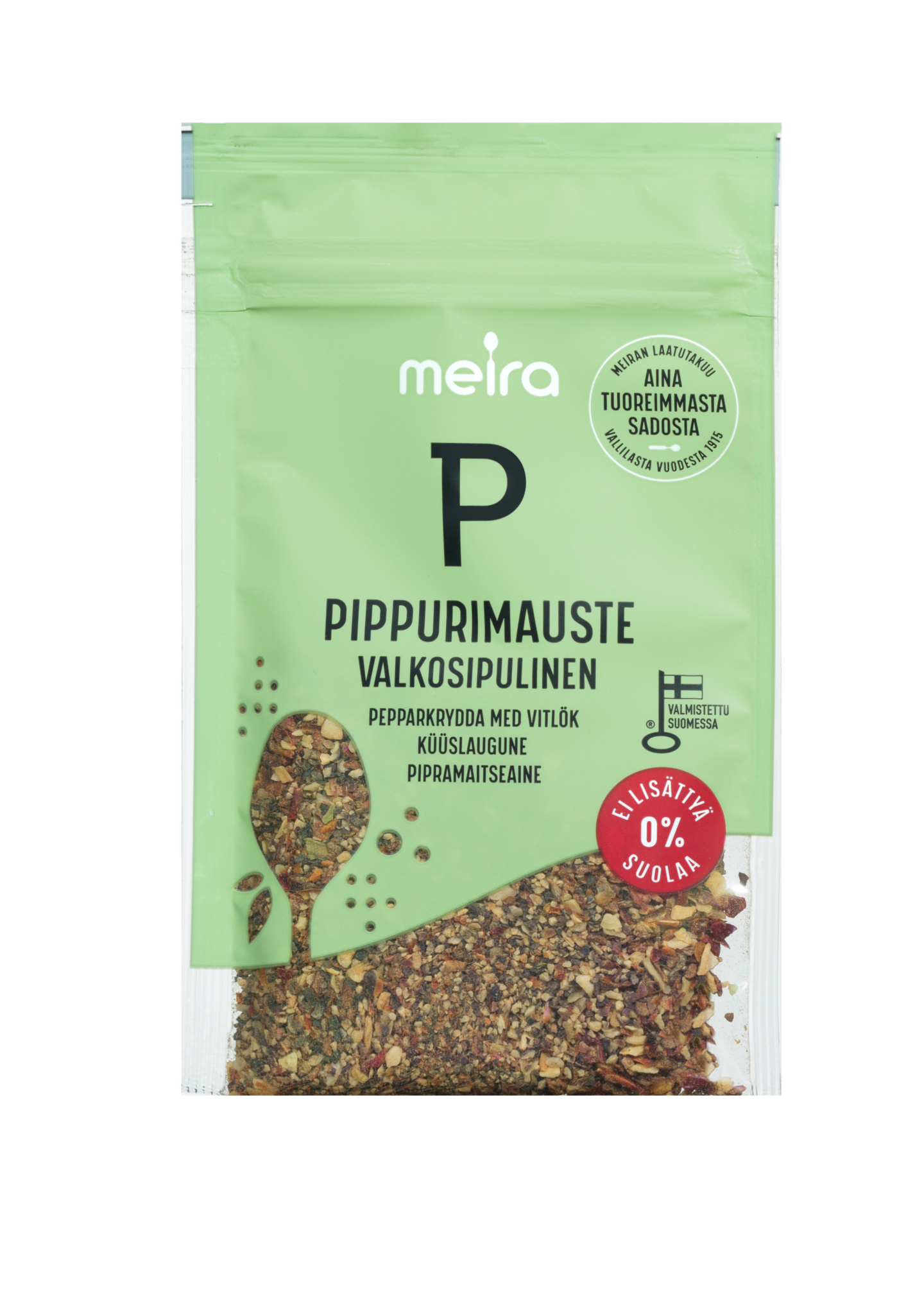 GluteenitonMeira Valkosipulinen pippurimauste on valmis mausteseos pataruokien, kastikkeiden, paistetun ja grillatun lihan sekä marinadien maustamiseen. Meiran laatutakuu: Meiran mausteet ovat aina tuoreimmasta sadosta, jolloin kaikki luonnolliset makuaromit ja tuoksut ovat tallella.