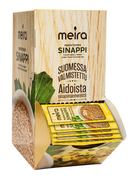 Meira Perinteinen Sinappi on valmistettu vanhaa hyvää sinapinvalmistuksen tietotaitoa kunnioittaen. Kotimainen, suomalaiseen makuun sopiva sinappimme valmistetaan tuoreista ja laadukkaista sinapinsiemenistä, jotka jauhetaan Suomessa perinteisellä kivimyllyllä. Sinappi ei sisällä sakeuttamisaineita, aromeja eikä turhia E-koodeja. Meira Perinteinen sinappi on merkitty suomalaisella Avainlippu-tunnuksella.
