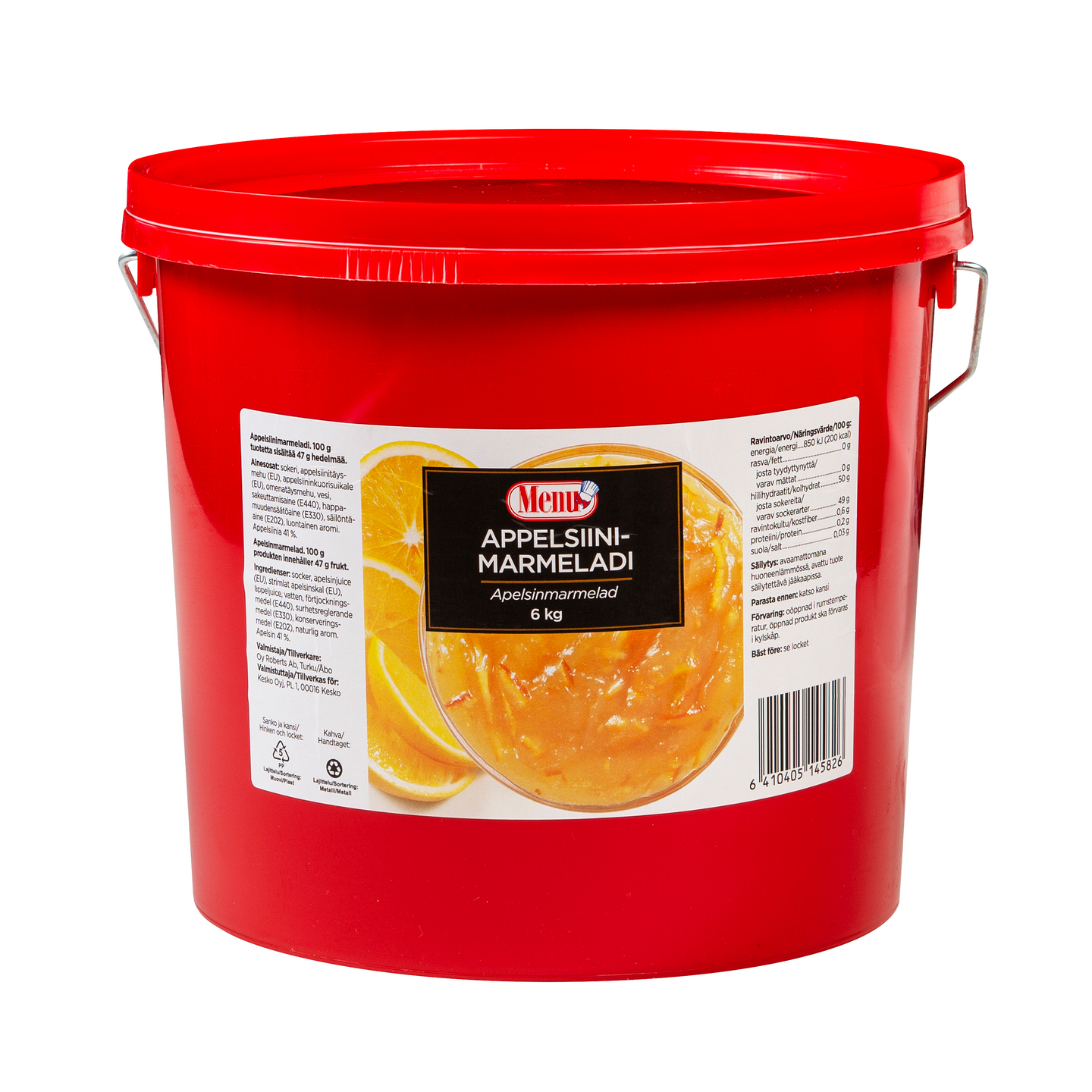 Sokeri, appelsiinitäysmehu (EU), appelsiininkuorisuikale (EU), omenatäysmehu, vesi, sakeuttamisaine (E440), happamuudensäätöaine (E330), säilöntäaine (E202) ,luontainen aromi. Appelsiinia 41 %.