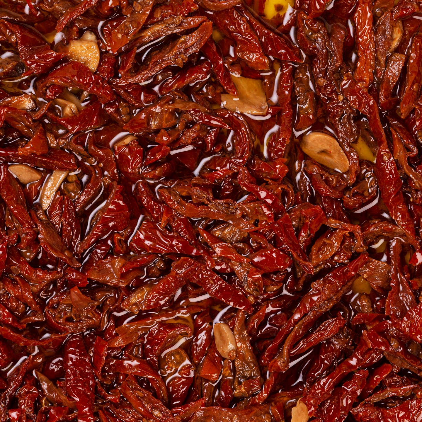 aurinkokuivattu tomaatti (muu kuin EU), auringonkukkaöljy, suola, valkosipuli, viinietikka, happamuudensäätöaine (E270)